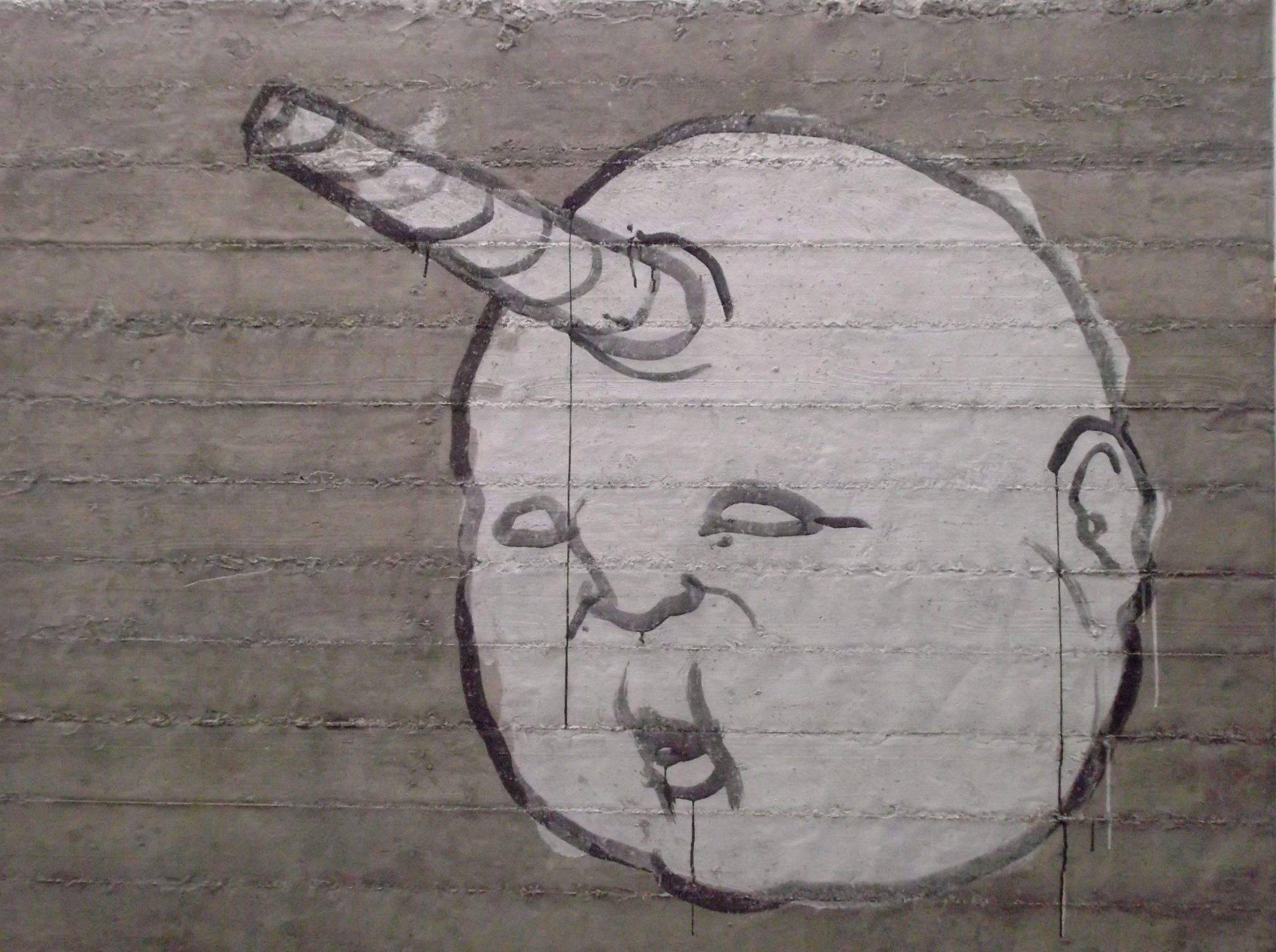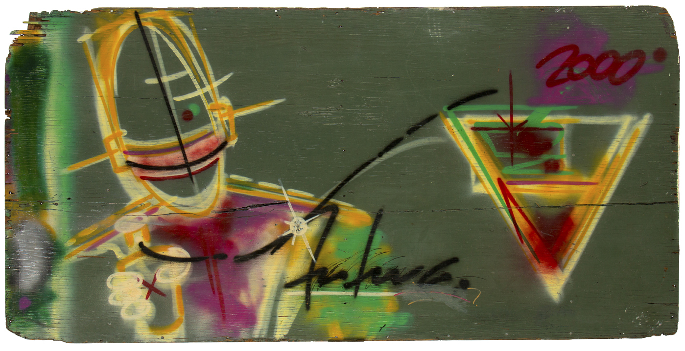 Stencil e spray su legno, 140,50×120 cm