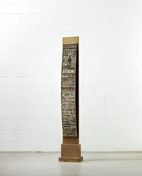 Dello stesso periodo La Colonna del viaggiatore, 1960, VIII di Arnaldo Pomodoro (lotto 19), il più importante scultore italiano vivente, stimata £60,000-80,000 (€75.000-100.000). Ha fatto parte della prestigiosa collezione del Barone Lambert ed e’ rimasta poi nella stessa famiglia fino ad oggi. Le opere di Pomodoro degli anni ’60 di queste dimensioni e qualità sono rare e di grande impatto.