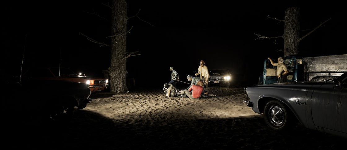 In conclusione troviamo lei. “Five Car Stud”, che dà titolo alla mostra, l’opera più celebre dell’intera carriera di Kienholz: realizzata tra il 1969 e il 1972, anno in cui venne esibita a documenta 5 a Kassels, prima di poter vedere la luce fu tenuta nascosta nel deposito di un collezionista giapponese per quasi quarant’anni. Oggi è parte della collezione Prada, ed è presente in Italia per la prima volta proprio in questa occasione. L’emozione che si prova accedendo a questa enorme stanza quasi completamente buia è indescrivibile. Il momento è catartico: nell’esatto istante in cui penetriamo all’interno di Five Car Stud, comprendiamo che tutto ciò che abbiamo visto nell’ultima mezz’ora non è che una fase preparatoria a questo. Davanti all’atto di violenza perpetrato dagli uomini bianchi sull’uomo di colore, il cui corpo consiste in una vasca di benzina in cui galleggiano le lettere fluo che compongono la parola “Nigger”, ci sentiamo impotenti, e curiosi, e schifati, e affamati di dettagli, e pietrificati dalla pena, ma restiamo lì. Restiamo immobili nella penombra ad osservare la scena cristallizzata dai fari accecanti delle quattro automobili che diffondono una clichéistica musichetta country, e nella nostra mente la violenza prende forma come la scena di un film horror.