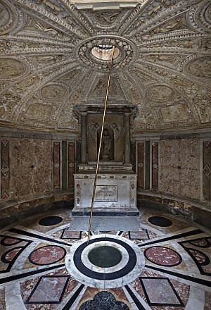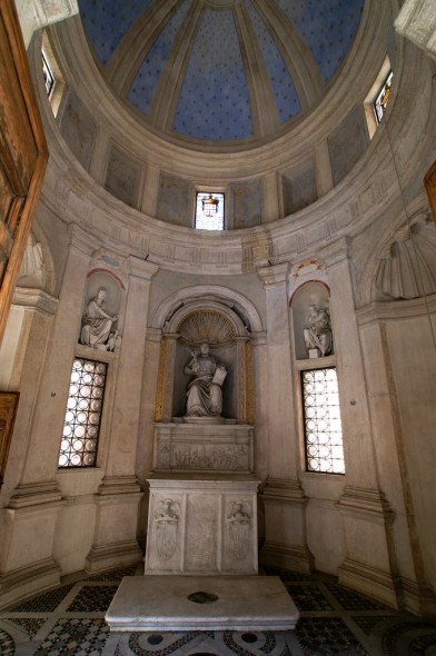 La forma cilindrica della struttura è stata sapientemente trasformata all’interno con alte e profonde nicchie, quattro delle quali ospitano piccole statue degli Evangelisti, mentre sull’altare è collocata una statua di San Pietro. Il ricco pavimento è interamente realizzato con tessere marmoree policrome, nello stile cosmatesco ben più antico, che tornò però assai in auge verso la fine del XV secolo. Bramante poi dimostrò tutta la sua conoscenza architettonica nella realizzazione della cupola, progettata in conglomerato cementizio, proprio alla maniera degli antichi – come fu per esempio nel Pantheon – e posta su di un tamburo ornato da lesene a formare un ordine sovrapposto a quello delle colonne. Ma le soprese non finisco qui. Proprio al di sotto del tempietto, vi è infatti una straordinaria cripta anche essa circolare, il cui centro indica il luogo dove venne piantata la croce del martirio di San Pietro.