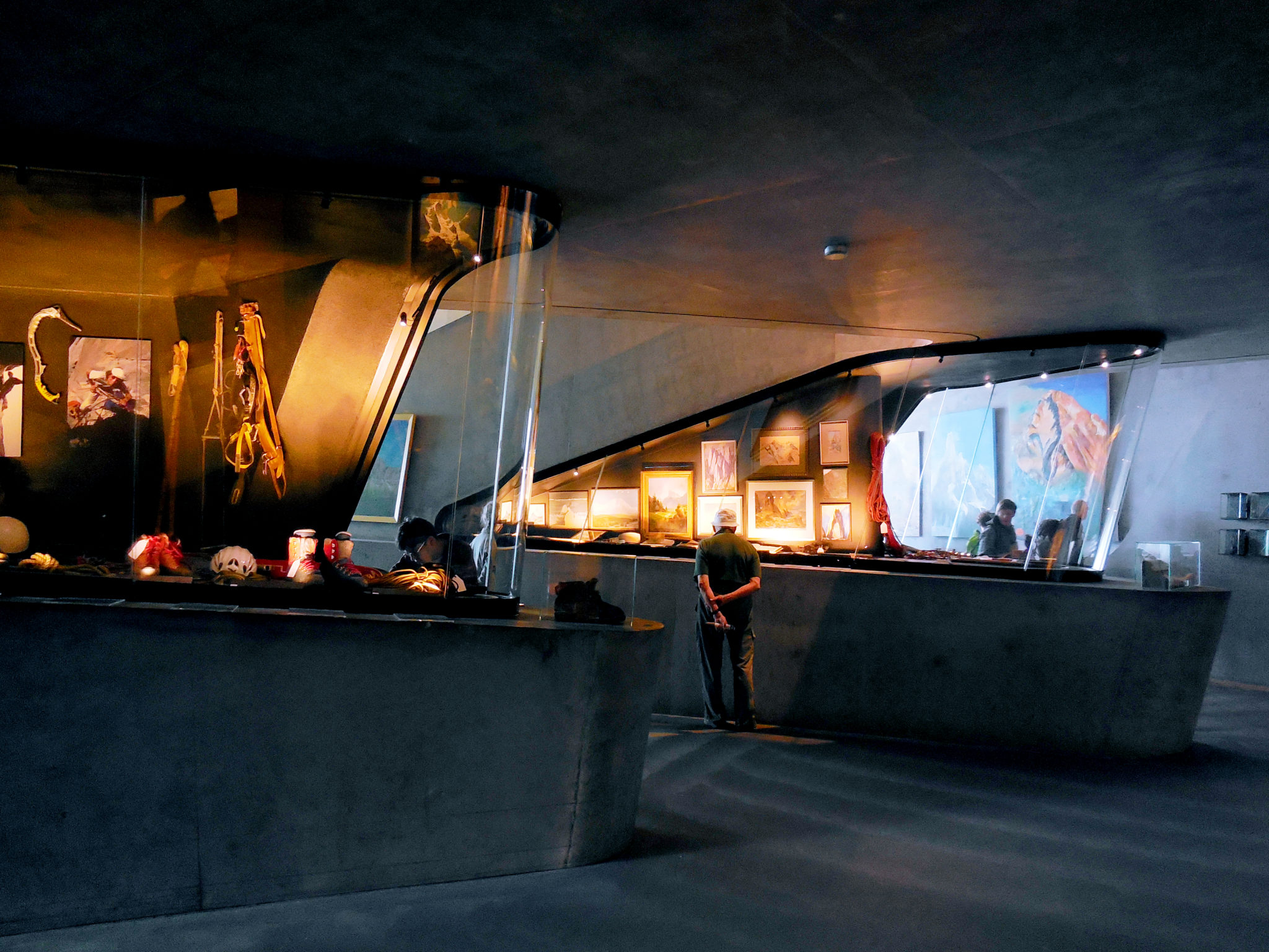Visitando l’interno del museo, salta subito all’occhio lo sfruttamento intelligente degli spazi, pensati non solo per opere d’arte, ma anche per cimeli e oggetti allestiti sulle pareti oppure esposti in teche in vetro ricavate nei muri e lungo i corrimano delle scale. Scarpe, corde e funi, moschettoni, ganci, chiodi e puntelli, racchette, vecchie tute e attrezzi consumati, ciascun oggetto ha una propria storia e racconta un’avventura, come testimoniano le molte fotografie documentarie in mostra. Uno dei piccoli antri che si aprono a latere del percorso ospita persino la ricostruzione in miniatura di una piccola grotta, mentre in un altro è allestita una gigantesca cartina geografica del nord Italia su cui sono indicate le cime più alte e i relativi alpinisti che le hanno scoperte o conquistate.