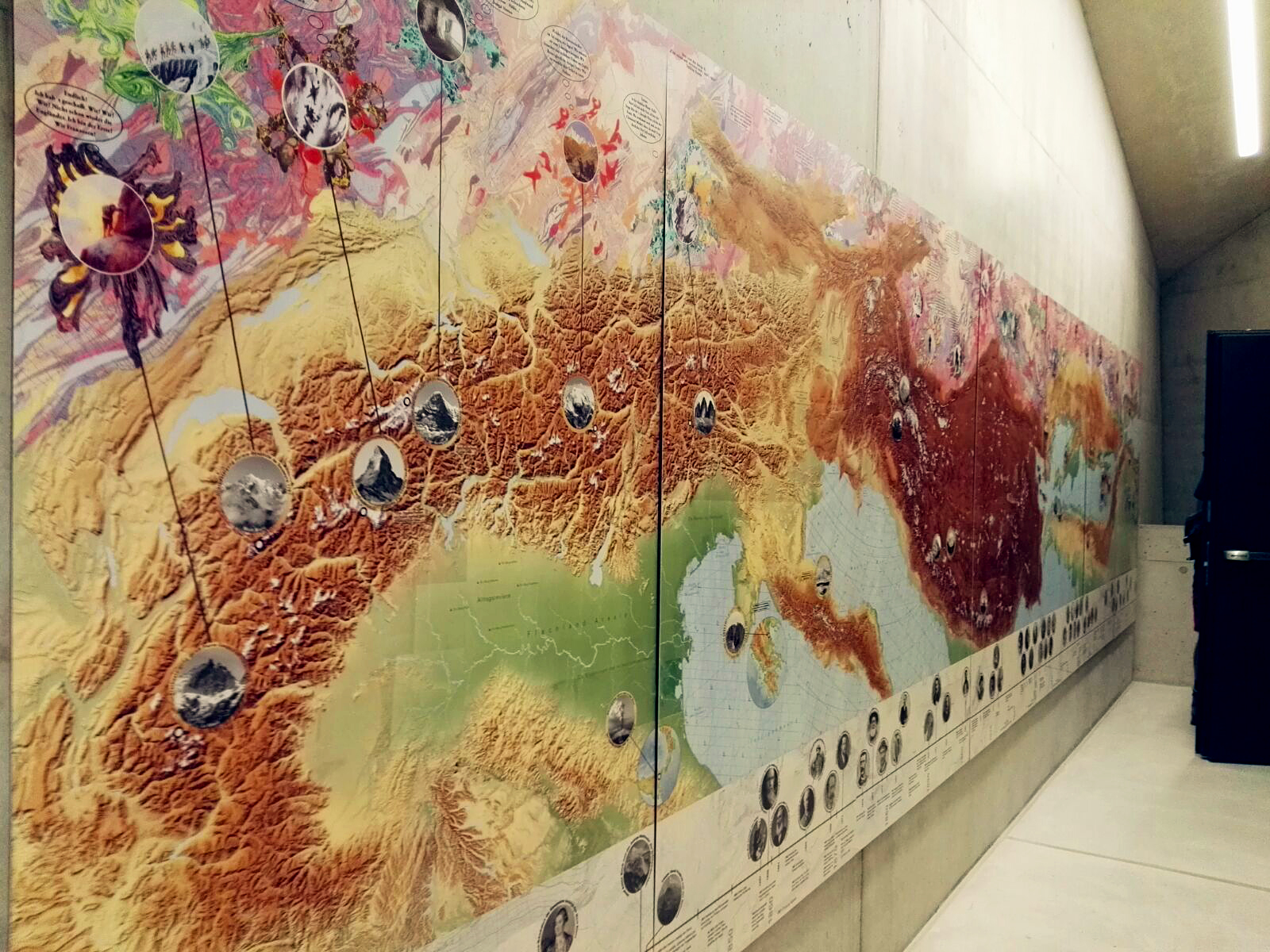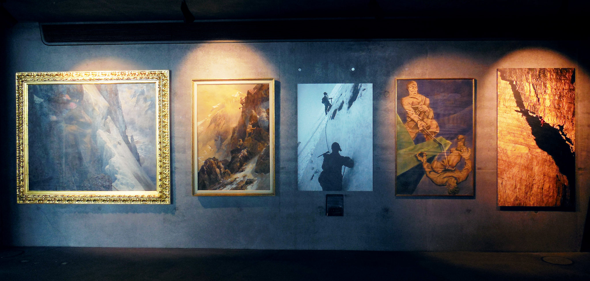 L’esposizione d’arte contemporanea si compone di opere pittoriche e sculture di numerosi e influenti artisti. Le prime opere osservabili sono le magnifiche tele di Heinz Greissing (Furchetta Nordwand, Vinatzer-Route, 1990), Carsten Westphal (Aconcagua South Face, 2016) e Herbert Brandl (Uschba/Kaukasus, 2016; Challenge Masherbrum/Karakorum, 2016), tutte raffiguranti la montagna in diverse condizioni di tempo e luce. Il muro adiacente è occupato da un quadro di Gotthard Bonell (Laurinwand, Parete Laurin, 2014/15) che ritrae una parete rocciosa ripidissima, e al quale la brillante curatrice affianca una vecchia picozza su cui è arrotolata della corda da arrampicata, strumenti memori di un’epoca in cui l’alpinismo raggiungeva altitudini da capogiro pur senza l’aiuto delle odierne tecnologie.
