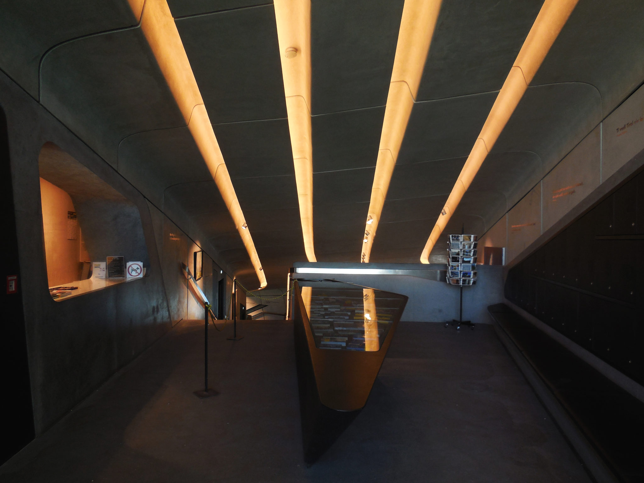 Una volta superata la biglietteria, ci si trova affacciati su uno spazio espositivo a tripla altezza che, seguendo l’inclinazione naturale del terreno, si tripartisce a livello inferiore in tre grandi bracci. In fondo a ciascun braccio si aprono tre finestroni di forma quadrilaterale che forniscono un ottimo apporto di luce naturale, anche se l’ambiente risulta già ben illuminato dai faretti caldissimi alloggiati lungo le scanalature parallele sul soffitto, che richiamano vagamente i sistemi di illuminazione utilizzati nei grandi tunnel delle metropolitane.