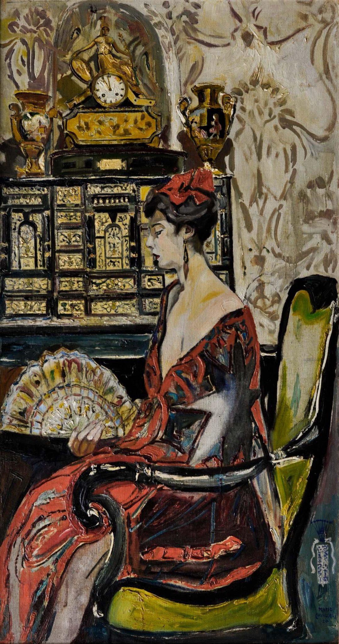 “Forse, oltre all’ascesa del fascismo, a indurlo al ritiro in Francia fu la consapevolezza della fine dell’epoca di cui era stato interprete così felice, cantore di quel mondo opulento che nell’alta borghesia europea perpetuò rituali e mode degli anni scintillanti della Belle Époque sino al primo dopoguerra. Oggetto dei suoi dipinti, gli «sguardi» e le «atmosfere» di un mondo lucente e ovattato al tempo stesso, in cui donne elegantissime (come nello splendido Incroyable-L’Aigrette, 1914, o nel non meno fascinoso Fuffi, 1920), disinibite e sicure di sé (Nudo con l’ombrellino, 1926 ca.), abitano interni opulenti e un po’ soffocanti, decorati in stile neo-rococò (Interno veneziano, 1918) o secondo il ricercato gusto orientalista (Estremo Oriente, 1922), oppure ostentano – ma con consumata indifferenza – l’antico lignaggio: come nel seducente L’orologio regalato da Napoleone I, dove Giulietta, composta e raffinatissima, siede di fronte alla pendola donata dall’Empereur al defunto marito, il conte Marazzani Visconti.