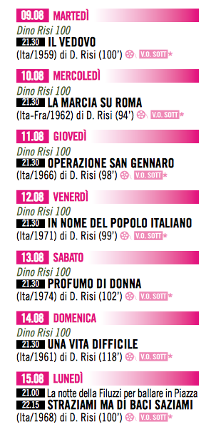 Mercoledì 10 La marcia su Roma il primo film con Vittorio Gassman e Ugo Tognazzi (1962). Poi Operazione San Gennaro in programma l’11. Di nuovo Gassman e Tognazzi il 12 agosto, nel film In nome del popolo italiano. Sabato sera sarà con Profumo di donna (sabato 13) per il quale Risi affida a Gassman il ruolo che gli varrà il premio come miglior attore a Cannes. Ancora Alberto Sordi domenica 14 in Una vita difficile (1961) e si chiude Straziami ma di baci saziami, lunedì 15, serata finale di Sotto le stelle del cinema.