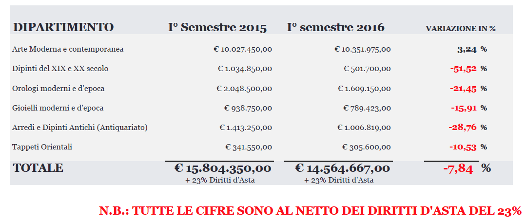 Non è stato così invece per l’Italia, che ha visto un mercato (soprattutto per i moderni e contemporanei) molto frizzante. Il semestre è stato positivo con un realizzo di 116,6 milioni (per le case d’asta interpellate, vedi la tabella uscita il 18 luglio 2016 sulle pagine del Corriere Economia). Alcune maison hanno visto una grande crescita. Come il caso della genovese Wannenes che ha puntato sulla qualità e sulla rarità nella selezione dei lotti e ha raddoppiato il risultato rispetto al 2015. Ma non solo. Il primo semestre 2016 è stato il migliore nella quindicinale storia della casa d’aste con € 11.735.402 (+102.2% sul 2015) e un aumento significativo delle percentuali di venduto per lotto (68,8% rispetto al 53% con un incremento del 29.8%) e per valore (149,7% rispetto al 99.4% con un aumento del 50,6%).