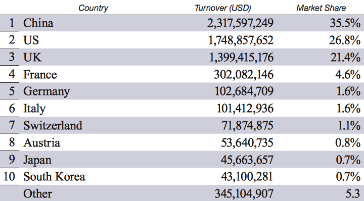A marzo 2016, quando è stato diffuso il report 2015 di Clare McAndrew sul mercato dell’arte si parlava già di leggera flessione rispetto al 2014. Anche i dati del primo semestre 2016 sui corrispettivi primi sei mesi del 2015 hanno visto un calo del 25 %. Secondo Artprice fino al 30 giugno 2016 sono state vendute a livello globale più di 252.000 opere d’arte con un fatturato totale di 6.53 miliardi di dollari (diritti inclusi), -25% sull’anno precedente. Se i dati non sono stati una grande sorpresa, ha invece stupito il sorpasso della Cina sugli Stati Uniti, che occupano il podio insieme alla Gran Bretagna con rispettivamente2,317,597,249 $,1,748,857,652 $ e 1,399,415,176 $.