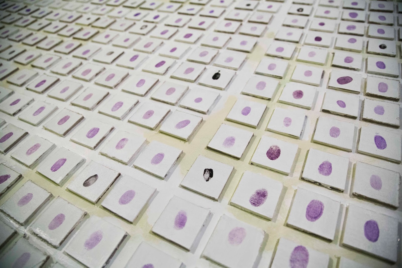 Sovrastante il banco di raccolta, una tavola di 4 metri quadrati sarà sospesa e appesa con dei cavi d’acciaio alle colonne che reggono l’ampio e vertiginoso spazio del mall, su cui si affacciano i tre piani del centro commerciale. Uno spazio in cui transitano migliaia di visitatori giornalieri. La tela raccoglie le impronte digitali di circa 900 donatori anonimi, raccolte da Ligotti in diversi luoghi d’Italia.