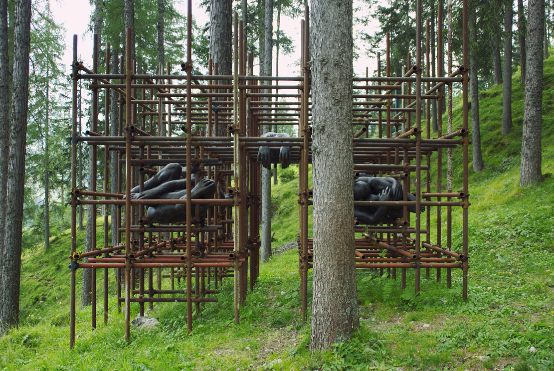 L.A.: Il significato primario è senza dubbio quello della condizione di ingabbiamento, di luogo di prigionia fisica e spirituale dell’essere umano: proprio da questa riflessione nasce il grande gruppo “Conditio Humana”, opera composta in totale da cinque corpi e conservata qui nella mia tenuta di Ciaminades. L’idea delle impalcature è nata entro questi stessi muri nel periodo in cui ho realizzato il mio nuovo laboratorio: a quel tempo avevo ancora un laboratorio vecchio e dovetti assistere i muratori per tutta l’estate mentre realizzavano quello nuovo. Lavorando con gli operai mi sono reso conto di quanta creatività ci fosse nei ponteggi: puoi spostare i tubi, modificare i livelli, la struttura si evolve continuamente. E così me ne sono innamorato, e ho preso la decisione di integrarli nelle mie opere. Un altro aspetto che mi aveva colpito è che nel loro essere strumento di lavoro, le impalcature sono strutture molto precise: durante la fusione il bronzo subisce un ritiro dell’1,7% e rimane quindi più sottile del gesso, ma grazie a questo espediente ho potuto trovare un modo per adattare perfettamente lo spazio circostante alla materia dell’opera. Da quel momento, ho cominciato a chiedere ai miei modelli di introdursi fisicamente all’interno di strutture provvisorie che costruisco appositamente per loro, facendoli adagiare sui tubi, e quindi realizzo le sculture all’interno di ulteriori impalcature finali. Questo mio modo di lavorare è comunque abbastanza recente, infatti l’opera “Conditio Humana” terminata non si trova ancora in nessuna pubblicazione.