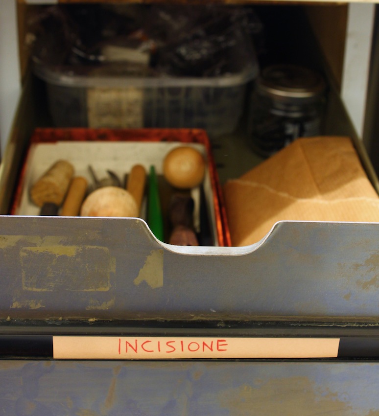 – lo studiolo: una stanza privata a disposizione degli artisti dove avviene tutto ciò che non fa strettamente parte del processo di stampa. L’artista può qui preparare la lastra, completarla, disegnare, acquarellare, pensare etc.