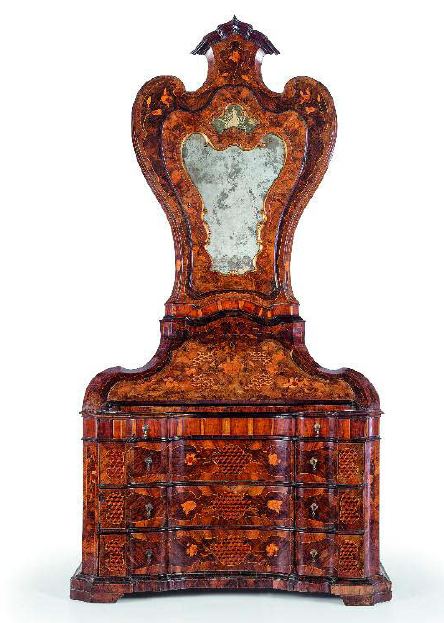impianto fortemente sagomato e ornato da grandi riserve mistilinee, quelle dei cassetti e della calatoia centrate da decoro geometrico tridimensionale, altre ornate da decoro floreale, base con fronte concavo a quattro cassetti, anta a calatoia celante scarabattolo a cassetti e vani a giorno, alzata di forma detta “a violino” con anta a specchio entro cornice dorata e piccolo specchi superiore inciso, cimasa mistilinea con timpano a cornice modanata, interno con ripiani a giorno; usure, rotture, mancanze, restauri
