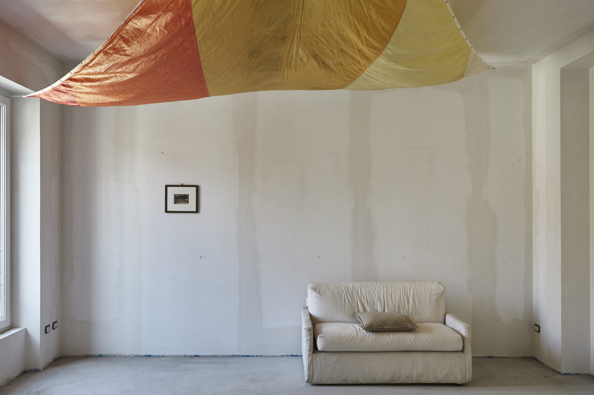 In The Habit of a ForeignSky i lavori appaiono come prese di possesso temporanee, protesi narrative di architetture interne, con possibilità di livelli di lettura amplificabili a seconda di diverse varianti; lavori privi di un aspetto univoco predominante secondo il quale analizzarli, ma tutti intrinsecamente volti a valorizzare il rapporto tra lo spettro della soggettività e lo spazio privato. Alcuni artisti interpretano il vuoto domestico cercando di ripristinare l’equilibrio tra una pragmatica del lavoro, il loro studio verso il quale sono riconoscenti conoscitori e il palazzo, ricreando un contesto allestitivo a sé stante, caratterizzato da rinnovate codifiche. La casa viene utilizzata come contenitore in cui l’artefice inserisce interventi esecutivi, facendoli diventare, di riflesso, un luogo in sé e per sé, un limite, un orizzonte neutro, predisposto a cancellare le tracce degli abitanti, passati e a venire. E’ il caso di Valentina Perazzini, che svuota le stanze a disposizione e le trasforma in un ambiente per la sintesi di natura. Alessandro Di Pietro, nell’attico, invece, crea spazi di meditazione lontani dalla quotidianità e immersi nel silenzio della parola, dove qualche oggetto isolato si manifesta come una presenza simbolica di informazione della memoria, scatola nera di un personaggio mai esistito.