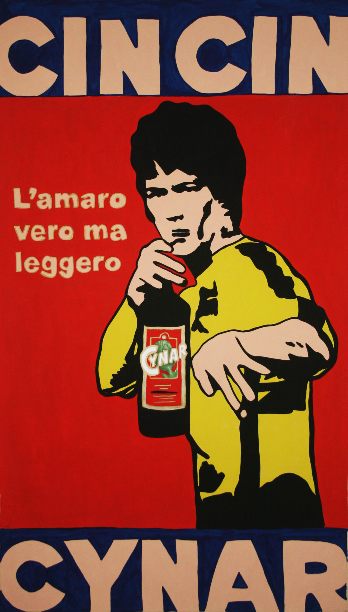 Ecco allora le opere della street artist napoletana Roxy in the Box che ironizza sulla mitologia di alcune figure leggendarie (il “re” del pop Andy Warhol e l’eroe del Kung Fu Bruce Lee) e alcune parole dal suono orientale (“Campai” per Warhol, “Cin Cin Cynar” per Lee), con curiosi giochi semantici tra comunicazione pubblicitaria e mitologia artistica. Sempre da Napoli, Iabo World gioca con la grafica della bibita più famosa del Novecento, la Coca Cola, un ideogramma cinese che significa “ipnosi” e il simbolo della spirale, a indicare il carattere manipolatorio del marketing. Dario Arcidiacono ha invece concentrato la sua attenzione alla globalizzazione economica, con un “Rettiliano Mutaforma” e un Black Block ugualmente “sponsorizzati” dalla Banca Mondiale. Infine, tre artisti cinesi (Li Xiaofeng,) ragionano, con tre linguaggi radicalmente differenti (astrazione, figurazione, installazione) sul rapporto tra i temi della mutazione del paesaggio, del corpo e dell’identità nel dibattito contemporanea.