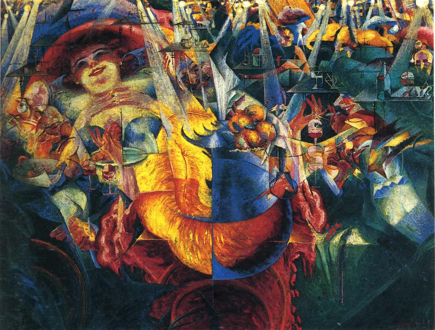 Il Futurismo nasce in un contesto storico in cui l‘Italia era indirizzata verso la massificazione. Il movimento futurista è un gruppo che si interessa alla folla da un punto di vista estetico esaltando l’anarchia. Sceglie di contrapporsi all’Italia che festeggiava i 50 anni di monarchia liberale, rappresentando una parte del paese rivoluzionaria da un punto di vista nazionalista. Il Futurismo è il primo movimento che si rifà e supera l’idea di Gauguin che elabora una concezione di arte come creazione della mente e non di un talento meccanico nato in accademia. Si avverte la necessità di creare qualcosa di nuovo basato su un senso della realtà e della scienza. Se Gauguin sosteneva che la modernità deve lanciarsi nel mito, per i futuristi significa invece tuffarsi nella scienza. Riprodurre una folla significa di questa, raccontarne gli stati d’animo e gesti rivoluzionari, concentrando così una realtà emozionale nel quadro.