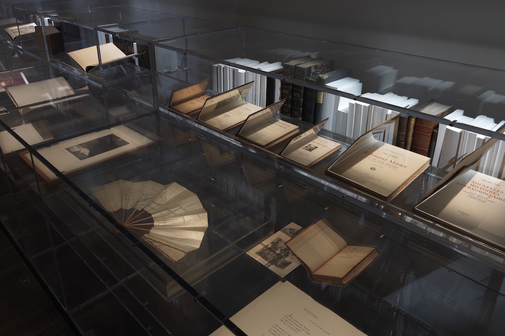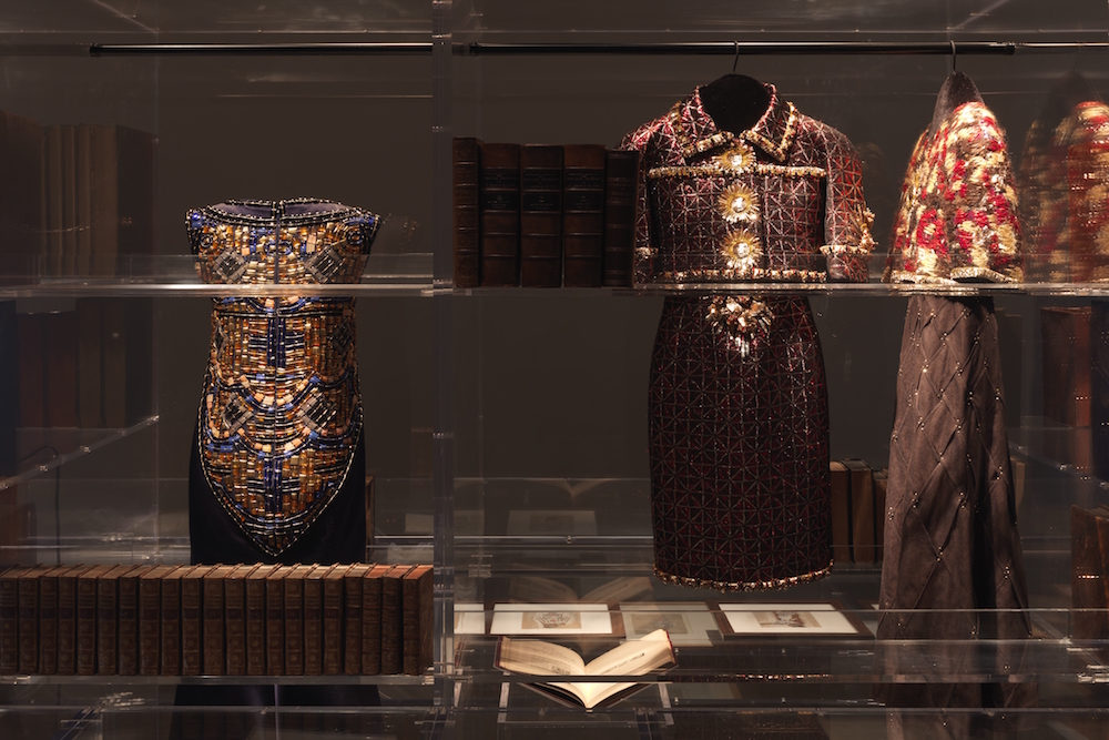 Al secondo piano del palazzo seicentesco sul Canal Grande, la mostra si apre su un ambiente reso intimo e raccolto da un’elegante illuminazione soffusa. Pareti d’oro bizantino citano il celebre appartamento a Parigi di Coco e dichiarano la passione della couturier per l’arte sontuosa e regale dell’antica Costantinopoli e della Venezia ottomana. Teche trasparenti concedono allo sguardo del visitatore, come fossero sacre reliquie, libri ordinati in fila o lasciati aperti su pagine significative o su dediche private che rivelano gli amori e le amicizie della stilista: da Jean Cocteau a Pierre Reverdy, da Max Jacob a Picasso, sino ai Dadaisti.