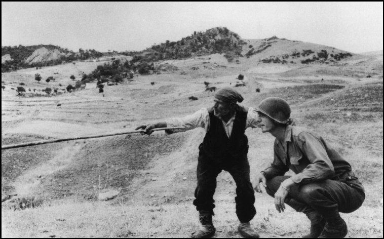 Ed è così che Capa racconta la resa di Palermo, la posta centrale di Napoli distrutta da una bomba ad orologeria o il funerale delle giovanissime vittime delle famose Quattro Giornate di Napoli. E ancora, vicino a Montecassino, la gente che fugge dalle montagne dove impazzano i combattimenti e i soldati alleati accolti a Monreale dalla gente o in perlustrazione in campi opachi di fumo, fermo immagine di una guerra dove cercano – nelle brevi pause – anche il recupero di brandelli di umanità.