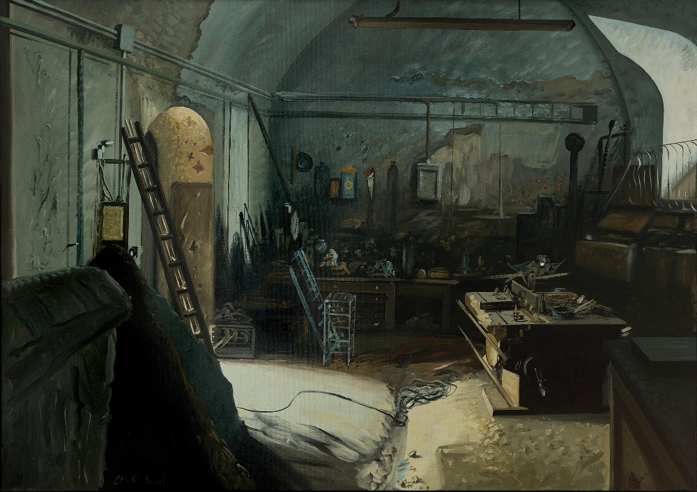 Si parte allora dagli esordi, dalla violenza deformante della guerra e dall’esplorazione di un mondo sommerso che, disceso nelle profondità della mente, riaffiora rifatto. Una luna sconsacrata illumina le cose, sulle scrivanie si depositano «gli strumenti umani» e le sedie conservano residui di chi se ne è già andato. I pavimenti sprofondano in altre storie, in paesaggi sognati tra corpuscoli di luce, briciole, polveri, descritte come presenze lampeggianti. E i panorami che si allargano improvvisi sulle pareti, come muffe e macchie enigmatiche, contengono fascinazioni fiabesche. I laboratori, le fabbriche, le officine non sono le tristi retoriche dell’abbandono, dell’archeologia, ma si riaccendono di colori. I lavori più recenti ci depistano, nascondendo dietro alla quiescenza il delirio che disorienta, il thriller.