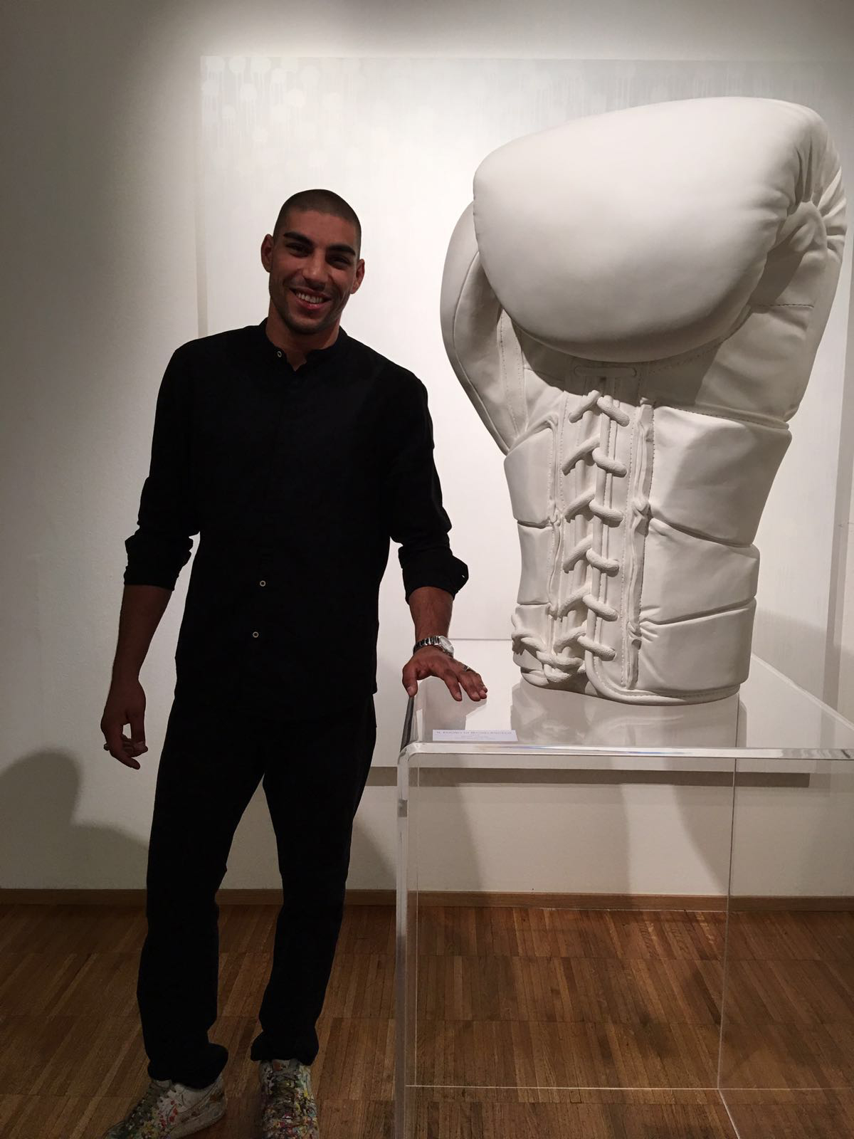 La ricerca artistica di Hassan infatti si fonda proprio su questo binomio; da un lato la passione per il pugilato, dall’altro il bisogno di trovare una espressione artistica che vada al di là della tela, per sfondare i classici paradigmi estetici e risaltare l’importanza del gesto.