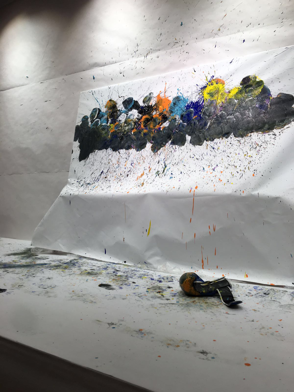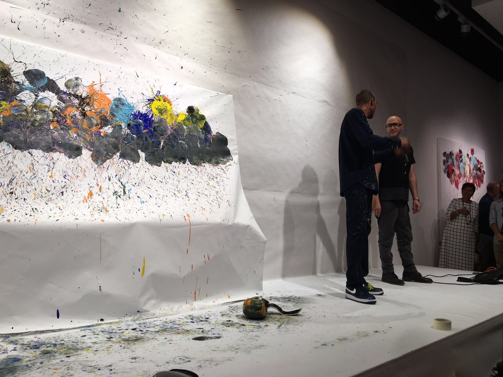 Il performer si arma di guantoni al posto di pennelli e prende a pugni la tela bianca; i colpi bene assestati compongono l’opera che risulta estremamente fisica, mentre i colori schizzano in ogni direzione.