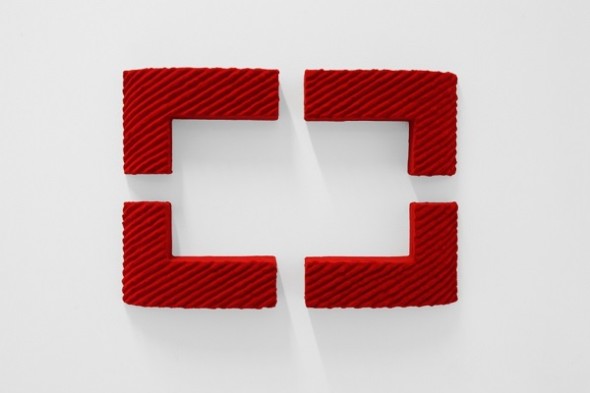 “E’ nel 1976, con Pittura GR – spiega Giorgio Bonomi – che si origina la ‘rottura del quadro’, la sua frammentazione, la sua dislocazione: la ‘disseminazione’, concetto, e pratica, questo che va molto al di là, di un semplice ‘spargimento’. Il lavoro sopracitato è un rettangolo ‘virtuale’, in quanto è composto dai quattro angoli del poligono equiangolo con il vuoto al centro e nelle interruzioni dei quattro lati. I quattro elementi angolari hanno uno spessore di circa cinque centimetri e sono ricoperti di flanella non preparata grigia. Da qui poi Pinelli, nell’arco di un quarantennio, svilupperà le sue disseminazioni multiple, le sue traiettorie; userà altri materiali; arricchirà le cromie con i colori fondamentali da cui derogherà pochissime volte; ma non abbandonerà mai la forma quadrangolare – infatti al “rettangolo tagliato” affiancherà anche il ‘quadrato tagliato’ – spezzata nei quattro lati, oppure solo in due, il ‘vuoto’ al centro dell’opera avrà in alcuni casi una forma a “croce”, in più il materiale sarà quello ‘vellutato’, tipico dell’artista, le superfici saranno anche parzialmente ‘rigonfie’ o ‘solcate’, i colori essenzialmente i primari e, a volte, i complementari, oltre al bianco e il nero”.