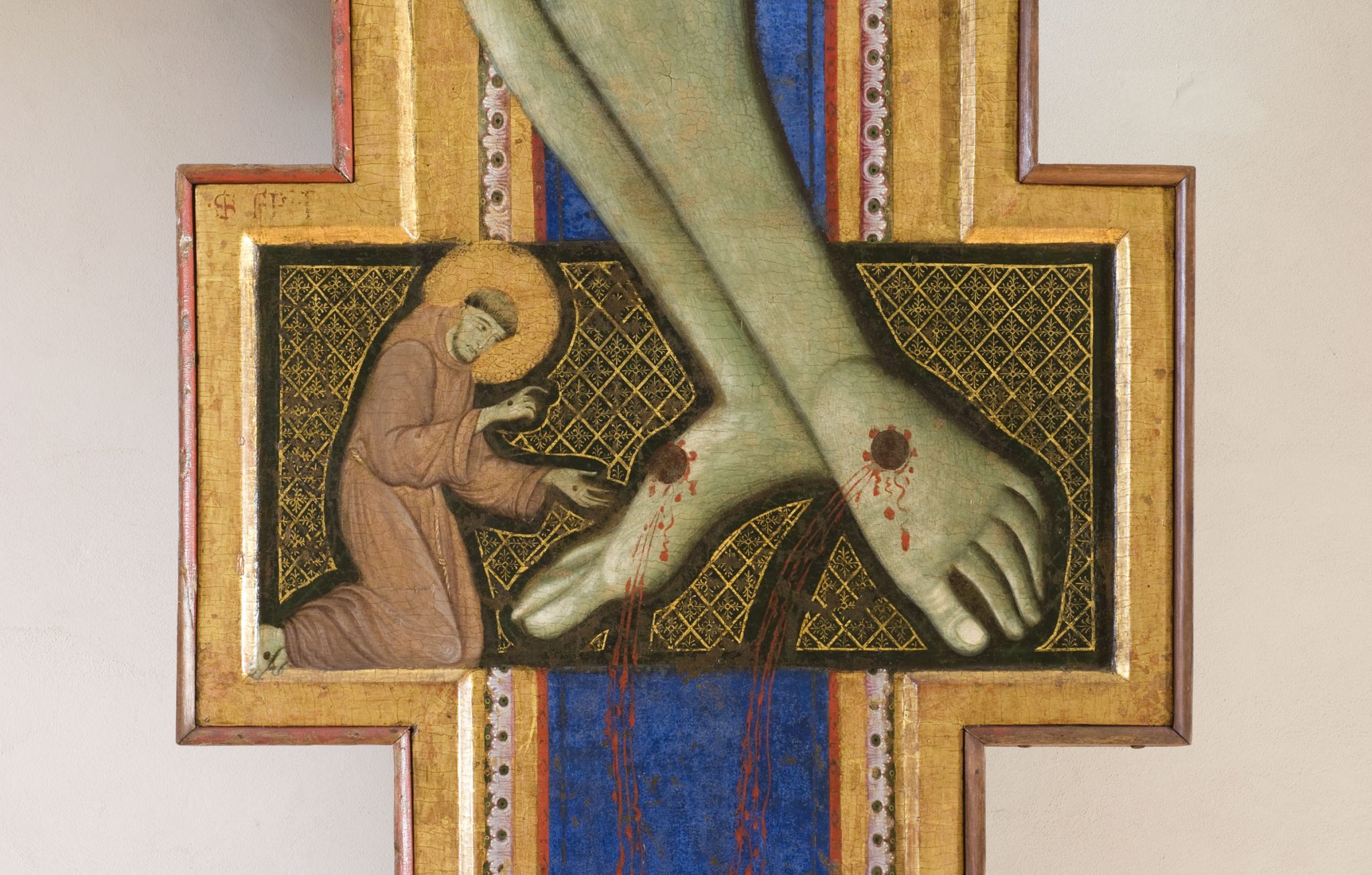 Il percorso si apre con la croce del Maestro di S. Francesco (1272) custodita nella Galleria Nazionale dell’Umbria, tra le prime a proporre il santo inginocchiato in adorazione dei chiodi e del sangue sgorgato dalla ferita del Cristo, e si chiude con il crocifisso del Maestro della Croce di Trevi (1315-1320) dove Francesco è raffigurato molto più grande che nelle croci duecentesche, appoggiato alla collina del Golgota.