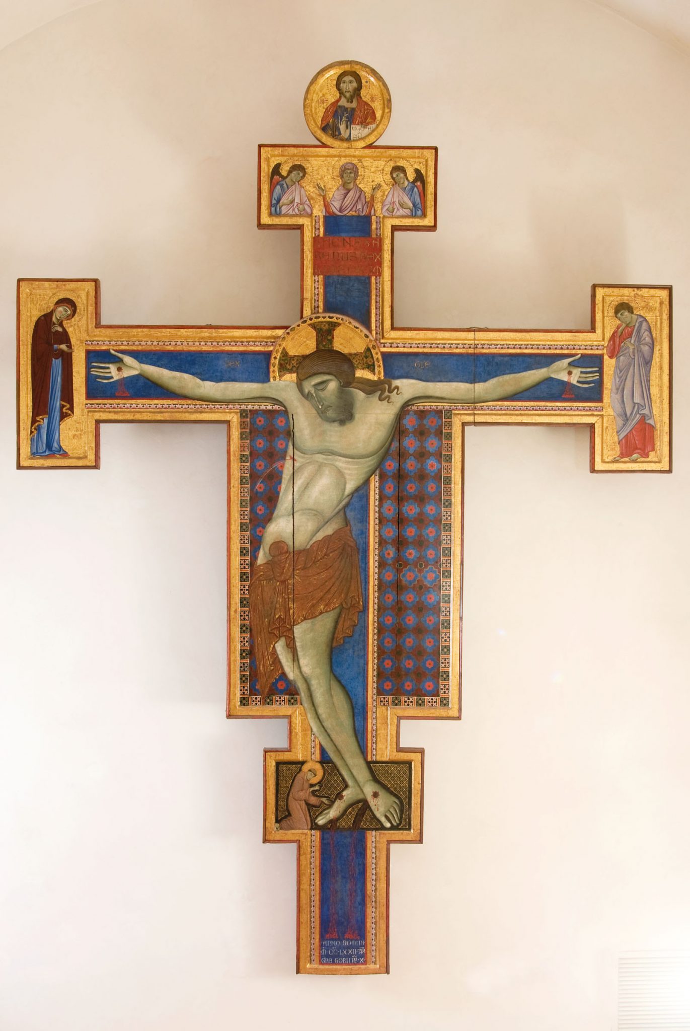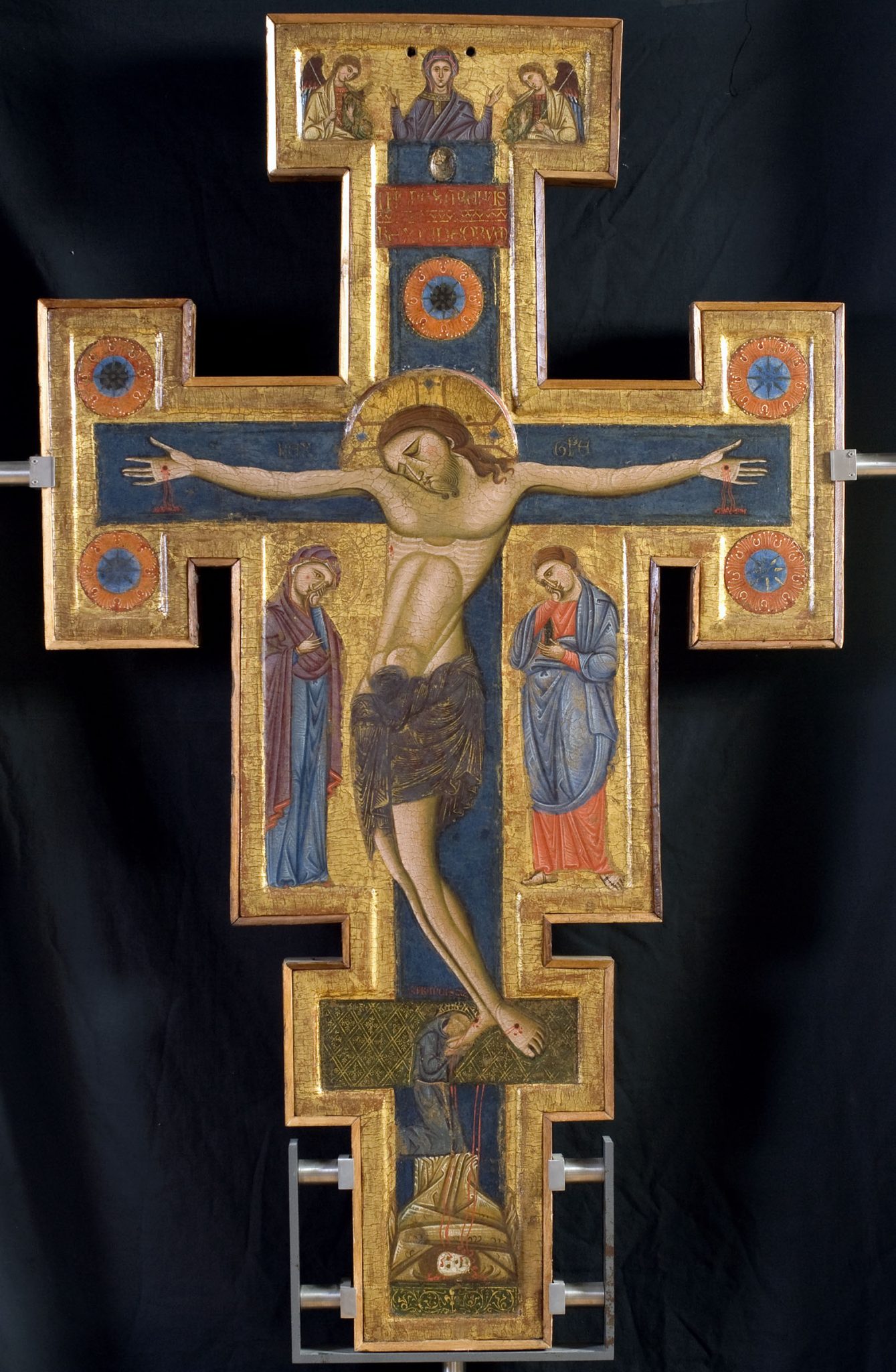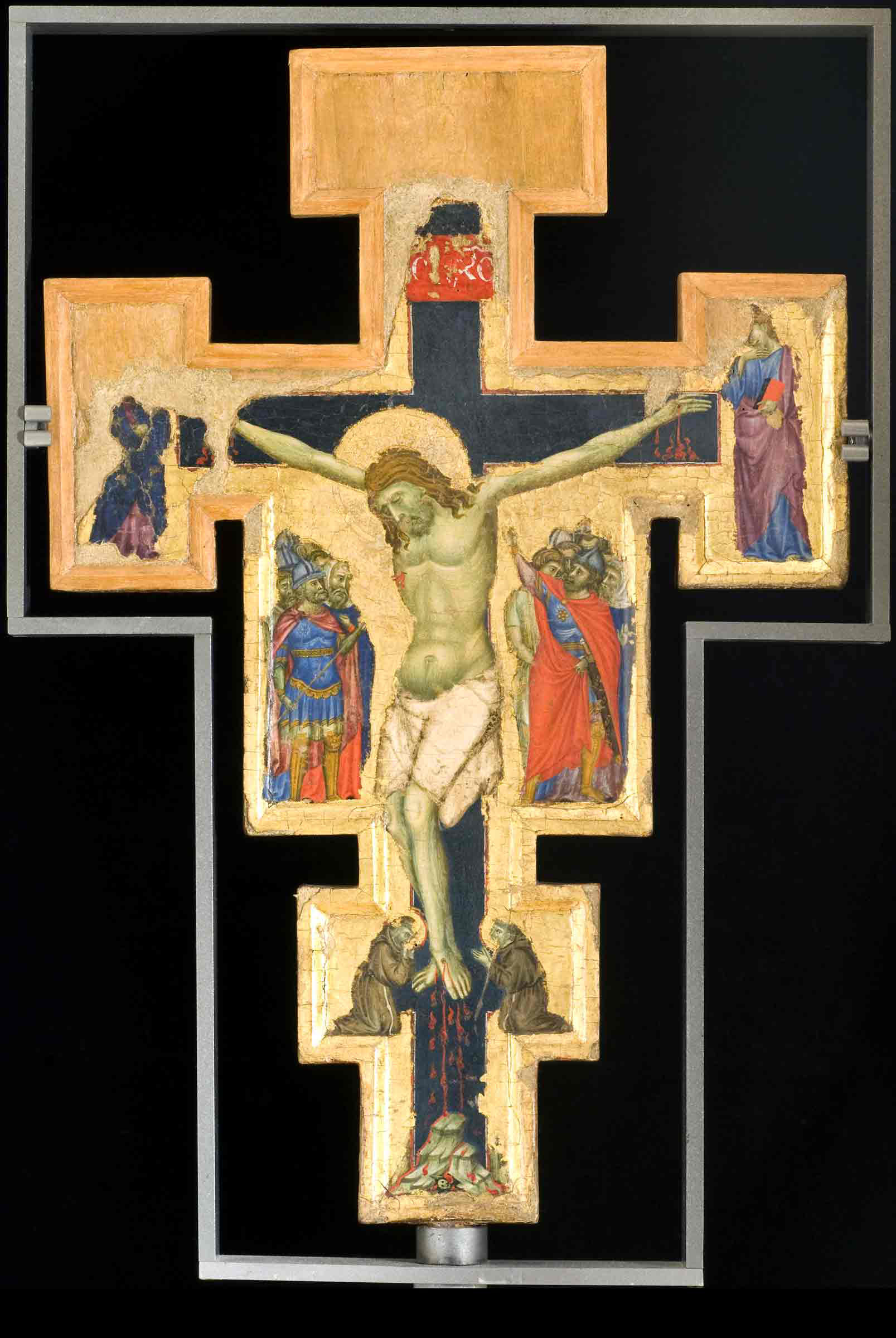 La rassegna segue il rapido sviluppo dell’iconografia della croce in Occidente a partire dal XIII secolo attraverso l’evoluzione del Christus Patiens (Cristo morto, col capo reclinato sulla spalla e gli occhi chiusi) dal modello di Giunta Pisano – riletto e affinato da Cimabue – a quello giottesco, dove il corpo non si flette più con eleganza ad arco ma pende dalla croce con tutto il suo peso.