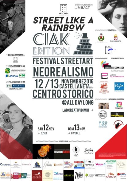 Castellaneta, Taranto. Ritorna nel centro storico della Città del Mito la III edizione del festival ”Street like a Rainbow – Ciak Edition” che – il 12 e 13 novembre 2016 – accoglierà dodici artisti provenienti da tutta Italia, in gara per un omaggio al cinema del Neorealismo.