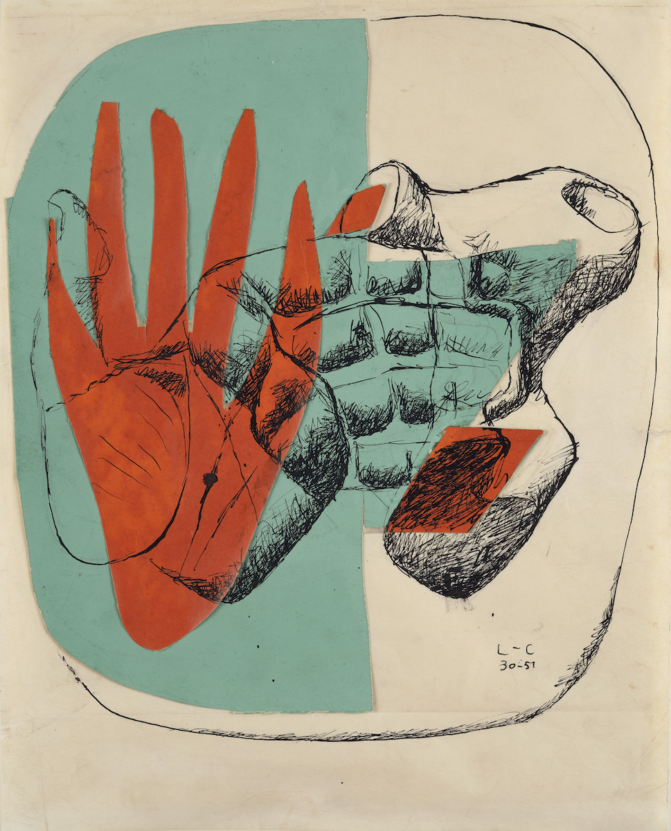 Le Corbusier dipingeva. Tutte le mattine, per sua stessa ammissione. Non si trattava di uno svago né di un esercizio di stile fine a se stesso, ma di un lavoro quotidiano, disciplinato, rigoroso, di indagine e sperimentazione delle forme. Non subordinato alla progettazione architettonica, semmai complementare, in quell’ottica di sintesi delle arti maggiori che caratterizzò il suo approccio al mestiere. Le Corbusier sconfinava – per riprendere il titolo della mostra – nella pittura, nel collage, nella scultura, per studiare le forme, verificare nuove logiche compositive ed equilibri cromatici, per poi tornare all’architettura e viceversa. Di questa pratica diventano un pretesto oggetti della quotidianità, come bottiglie, caraffe, un violino, ma anche simboli e figure, tra cui la mano aperta, il toro, il corpo femminile.