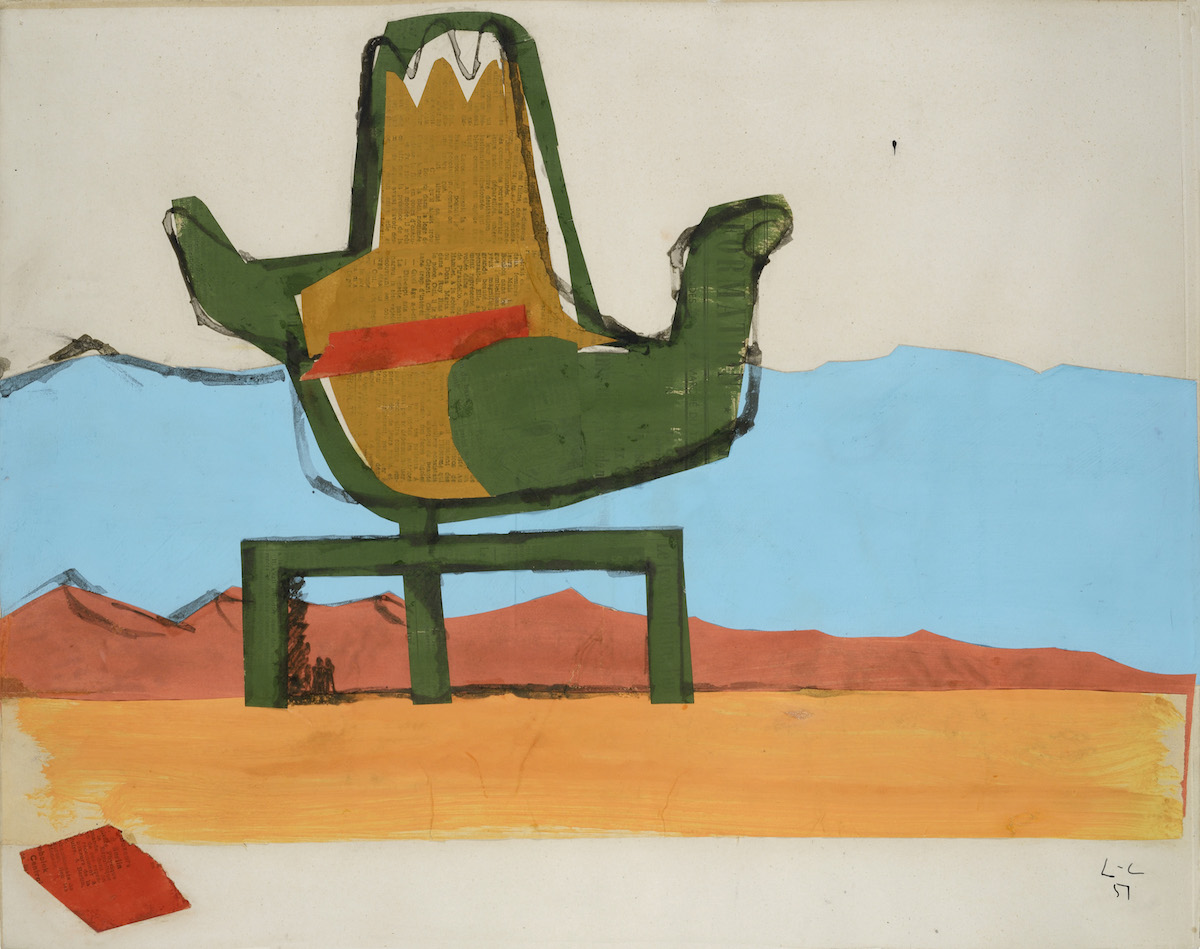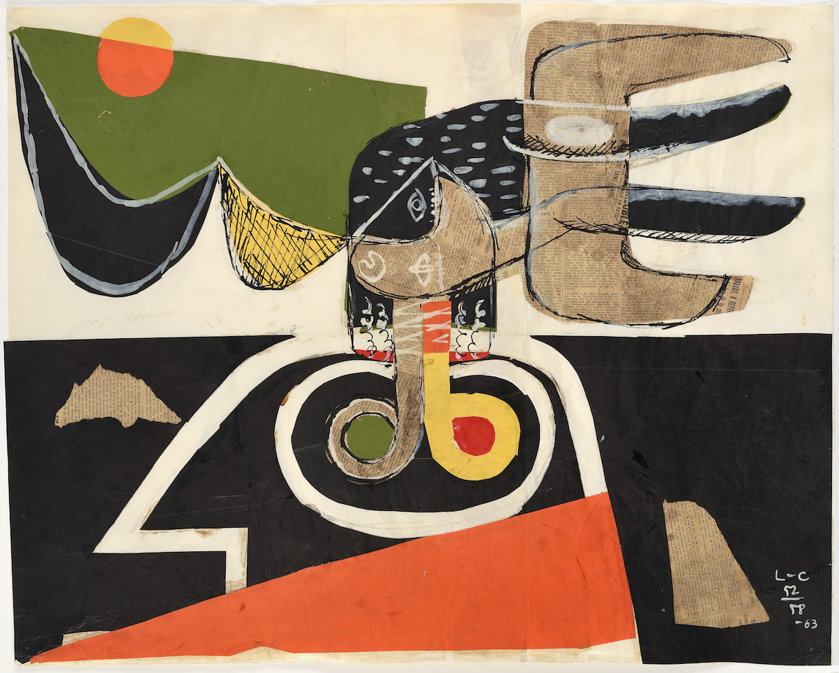 Curata da Esther Giani, in collaborazione con la Galerie Zlotowski, la mostra allo Iuav riunisce 23 opere – prestiti della galleria parigina – ordinate secondo un criterio tematico all’interno di ampie nicchie, in un ambiente oscurato. Sono disegni a china, nature morte dipinte con la tecnica del gouache, studi compositivi a pastello e grafite, collage di carte colorate e ritagli di giornale, datati tra il 1922 e il 1963, due anni prima della scomparsa dell’architetto. C’è anche una scultura in legno policromo, Ozon Opus I (1947), un totem di segni e forme organiche, che prende il nome dal paese dei Pirenei dove Le Corbusier si era ritirato nel secondo dopoguerra e dove ebbe occasione di collaborare con l’ebanista Joseph Savina.