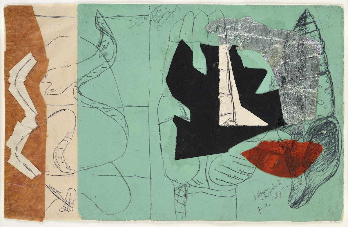 collage di carte colorate e fogli di giornale, gouache bianco e inchiostro di China su carta