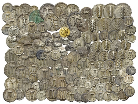 Non troverebbe altrimenti giustificazione l’operazione – commercialmente rischiosa ma di evidente utilità scientifica – costruita dalla casa d’aste romana attorno a un reperto mozzafiato: un “ripostiglio” di monete incluse (con il conio in rilievo sul dritto e incavo sul retro) d’argento in eccezionale stato di conservazione coniate tra il VI e il V secolo a.C. dalle zecche achee magnogreche di Sibari, Metaponto, Crotone e Caulonia (lotto 74 – € 180.000/220.000).