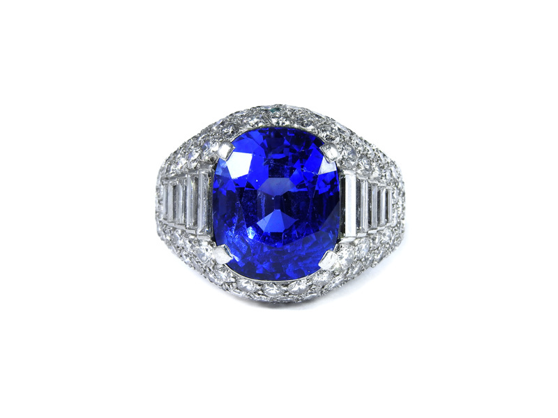 zaffiro taglio ovale ct 11 circa, diamanti taglio a brillante rotondo e a baguette ct 3,50 circa complessivi, g 16,31