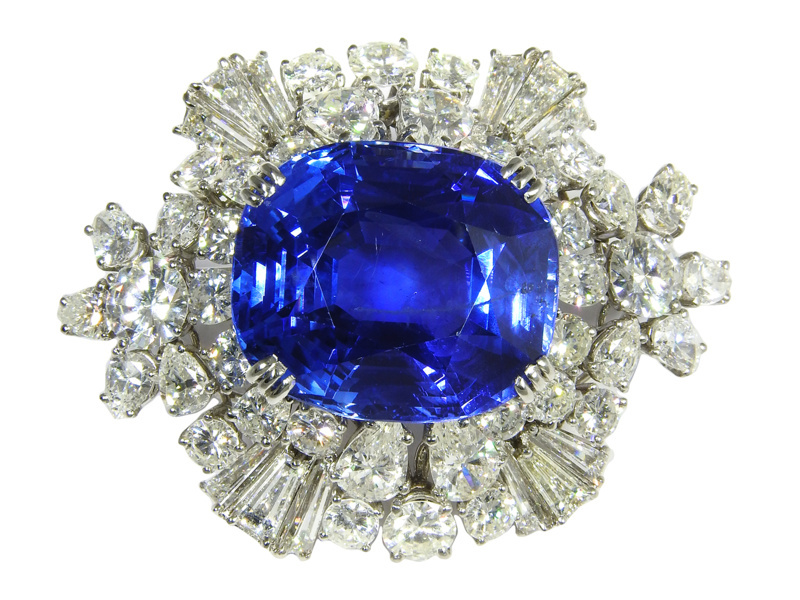 Spilla in oro bianco, platino, zaffiro e diamanti Anni Sessanta
