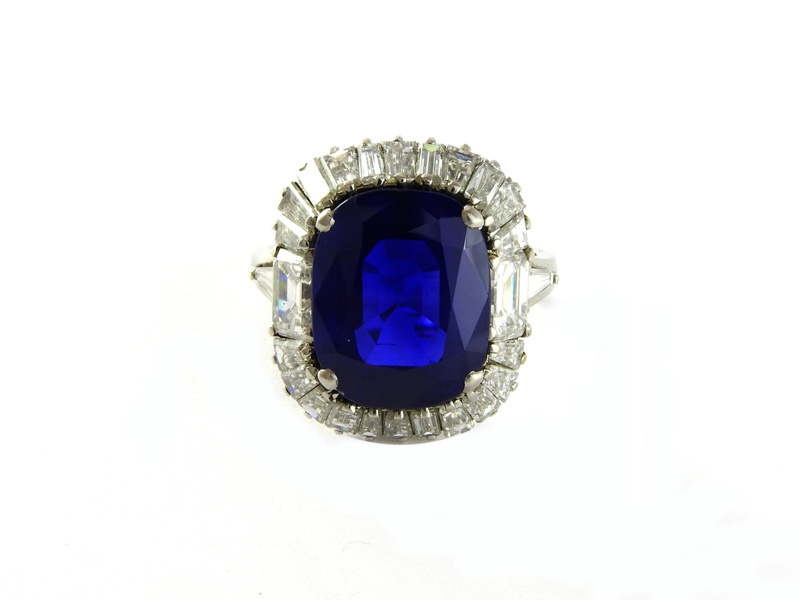 zaffiro taglio a cuscino ct 10 circa, diamanti taglio rettangolare ad angoli tronchi e tape ct 2,50 circa complessivi, g 10