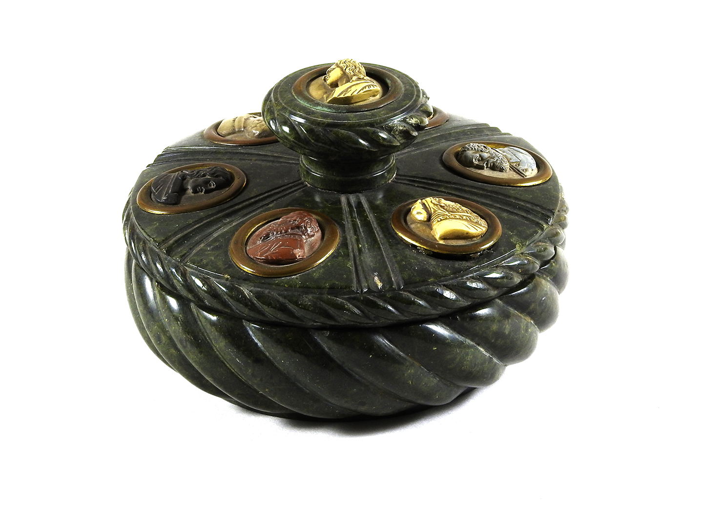 Calamaio rotondo in porfido verde XIX secolo coperchio intagliato con sei spicchi, ognuno dei quali reca incastonato un cammeo ovale in pietre dura raffiguranti pittori rinascimentali (uno sulla presa del coperchio), bordi intagliati con motivi a corda, difetti diam cm 14,5 Round Green Porphyry Inkstand, 19th Century