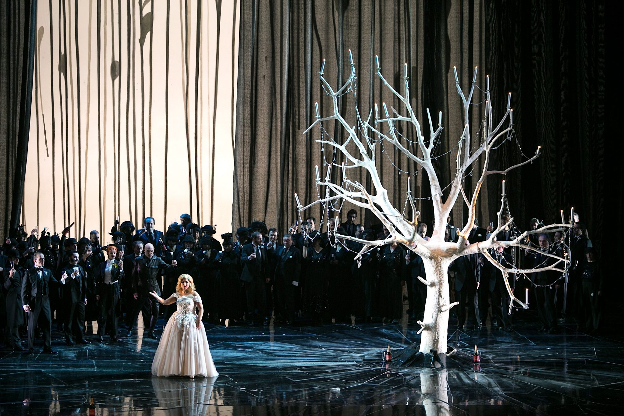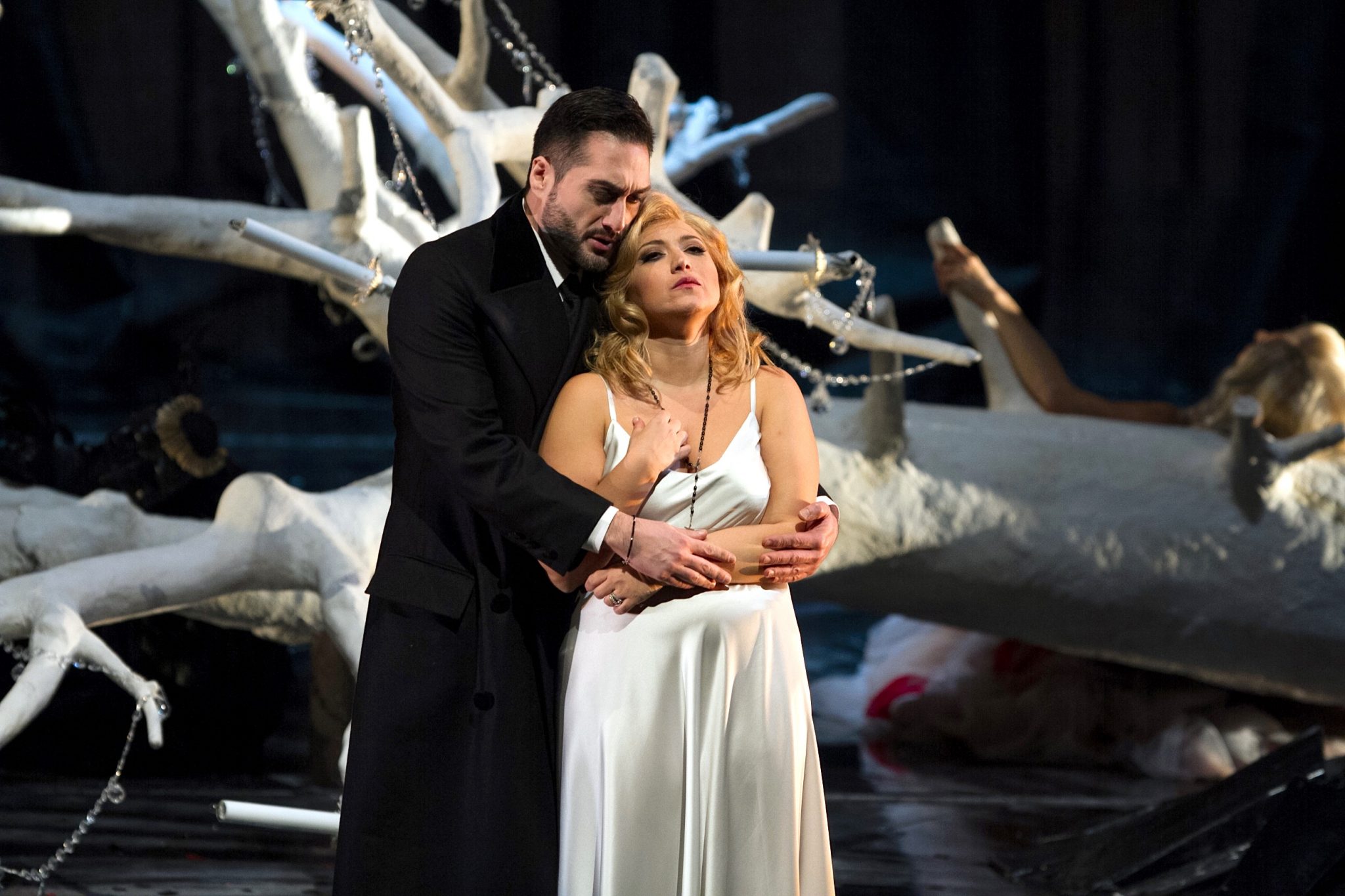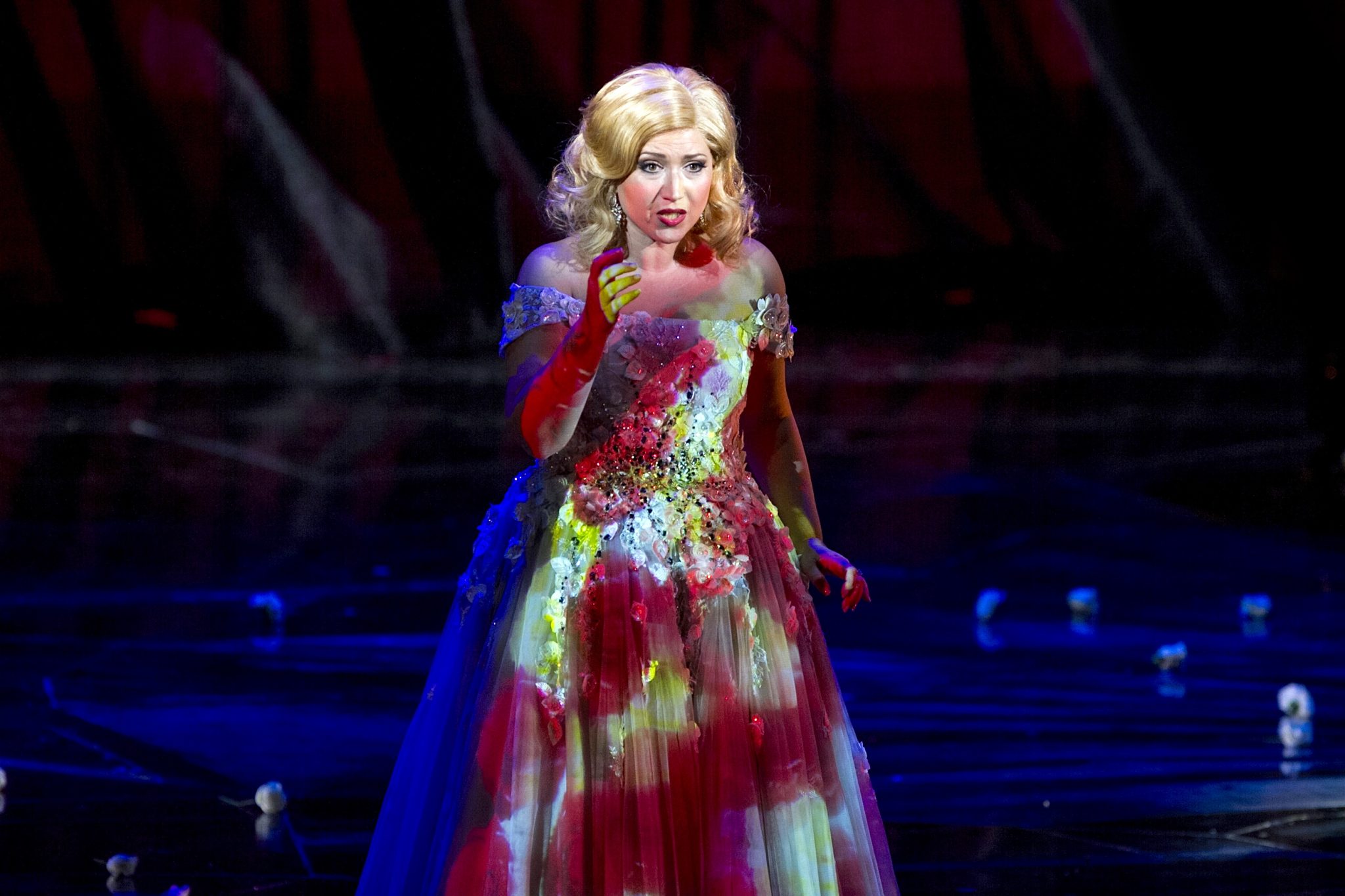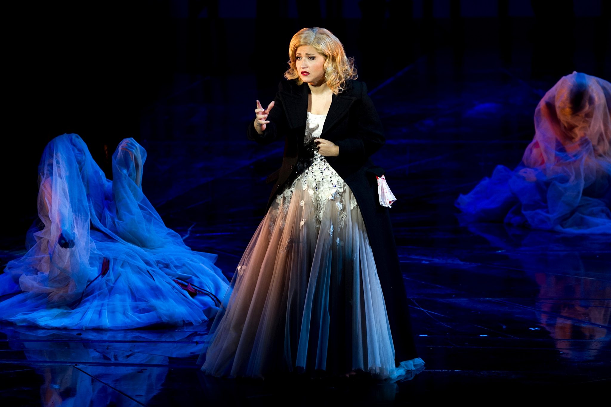 Nel terzo atto un gigantesco specchio riflette la scena, quasi a voler amplificare l’effetto di distorsione temporale, uno spettacolo che dal punto di vista visivo funziona, soprattutto nei quadri delle feste, dove si apprezza il movimento della masse da parte del regista. Ottima la prova di Desirée Roncatore, vera regina della festa la quale propone una Violetta Valery interpretata con eleganza e ben cantata, esecutrice quasi impeccabile; dopo un primo atto minore, dettato forse anche dall’emozione la voce sale acquistando sicurezza, conquistando il pubblico genovese.
