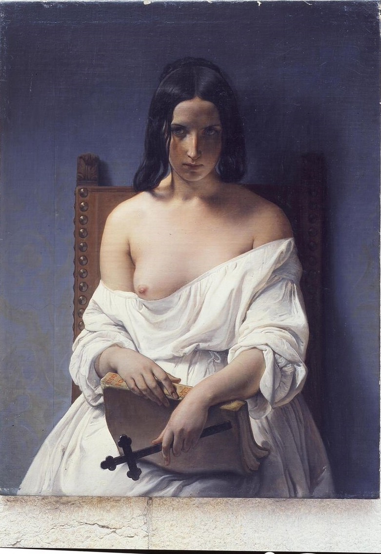 Il secondo percorso invece, è un passaggio a ritroso e si sofferma sulla consacrazione dei cosiddetti pittori primitivi ovvero dei pittori precedenti a Raffaello – ritenuto il simbolo del Rinascimento – fino a quel momento considerati artisti di ” secondo ordine”, fatta eccezione per il Perugino e pochi altri . Nel 1811 infatti, Vivant Denon, direttore generale del Musée Napoleon ( come si chiamava allora il Louvre ) decise di intraprendere un viaggio in Italia per cercare personalmente le opere del Trecento e Quattrocento con lo scopo di ricostruire le origini , la cosiddetta “infanzia” dell’Arte italiana. Da quel momento si capisce invece il valore di quell’Arte nell’armonia delle opere di artisti come Taddeo Gaddi, Benozzo Gozzoli, Zanobi Macchiavelli, Giovanni Mazone e Luca Baudo. In questo spazio espositivo sarà eccezionalmente esposto il Monumento funebre a Guidarello Guidarelli di Tullio Lombardo concesso per la prima volta in prestito dal Museo d’Arte di Ravenna. Segnaliamo inoltre due opere che l’allestimento della mostra pone in un significativo dialogo tra loro. Un contrasto che non sfuggirà ai visitatori più attenti. Al centro della sala del secondo piano troneggia infatti la Venere Italica di Canova che nell’intento dello scultore doveva onorare il genio dell’Italia. Vicino la splendida scultura invece, alla chiusura della mostra, troviamo un’opera particolare , il dipinto di Hayez dove l’Italia non ha le sembianze di una divinità, ma quelle di una fanciulla del popolo. Bella e con lo sguardo fiero, ma oltraggiata. Un’allegoria della nazione dolente dopo i fatti del 1848 e che invita ad una profonda riflessione ancora oggi.