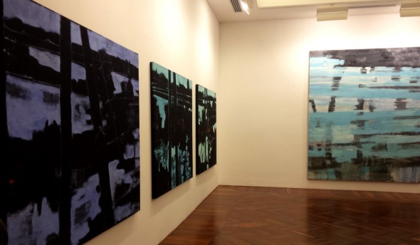 Doppia acidità spezza l’acquario. Infrange la vetrinetta e trasporta nel fiume. River (2002-2011). Mirabile flusso tra neri che scappano e bianco-azzurri-violetti che corrono. Via. Spezzate di rive e orizzonti più o meno limitanti, pali piantati nel grembo che spezzano e spezzettano isole, terre del fiume. Fratture di colore. Blocchi, zolle che sono sempre isole. Tagliati e colati con violenza pacifica da spazzolate continue e trancianti di celeste. Specchi filiformi che si riflettono nei negativi di cobalto, profondissimi e interminabili. Fragore. Precipita la Cascata (2005) su un anfratto delle scale del Camec tra sassi di gommapiuma passati allo spray. Salto nella condizione alpina e spartiacque. Balzo temporale tra sezioni. Memoria di una mostra, Nobu at Elba, fatta a Villa Panza di Biumo a Varese nel 2004. Ritorno al presente. Ultima sala “a cui tutto ritorna”, tanto per rinvangare l’arché greca. Arcipelaghi cuciti assieme tra stoffe di uno stesso colore. Gradazioni. Temperature che assorbono slanci di energia costanti: bagliori che brillano il cielo propagandosi per la costa e per i fondali del mare. Meduse di solvente che si lanciano nell’opera lasciando che i tentacoli scalfiscano la superficie. Rigagnoli di senso in uno sfondo che si espande. Composizione di colatura conciliata nel segno. Sposata nel pastello. Perché “niente al mondo è celibe, e tutto per divina legge, in una forza si incontra e si confonde”. Percy Bysshe Shelley.