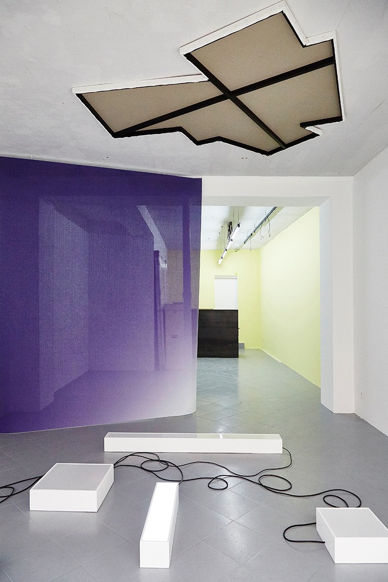I moduli musicali di Brown prendono forma e diventano volumi luminosi appoggiati a terra. Un filo nero li unisce, come un disegno a matita tracciato sul pavimento della Galleria. Ogni modulo si caratterizza per un’intensità luminosa propria, che muta sulle frequenze di un ritmo ondulatorio lento e aleatorio. La luce si materializza in uno sfumato tipicamente pittorico, attraverso una tela violacea che cala dal soffitto per scendere fino al pavimento, in netto contrasto con il colore giallo del muro retrostante della Galleria. Come un affresco a soffitto, una tela di forma irregolare completa lo spazio visivo dell’installazione. Un telaio, invero, perché la tela é capovolta, e ci mostra il suo retro, la sua struttura, dipinta di nero al fine di diventare essa stessa il soggetto dell’opera d’arte, a discapito dell’immagine alla quale tradizionalmente rende servizio. L’opera si costituisce quindi, attraverso la decomposizione degli elementi pittorici tipici della storia della pittura, come costruzione nuova e spaziale poiché, come afferma l’artista, «la pittura non é un punto di vista, ma uno spazio».