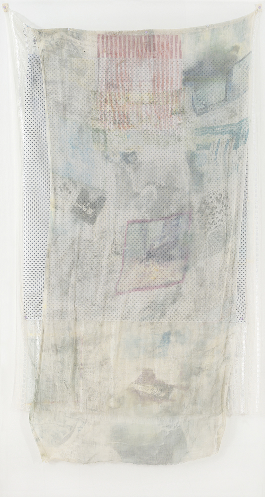 tessuto, carta e decalcomanie cm 200×98, firma e anno su telo centrale (telo pois), dichiarazione d’autenticit‡ dell’artista e firma con timbro Leo Castelli (New York) datata 08/05/1982 su foto, entro teca in plexiglass.