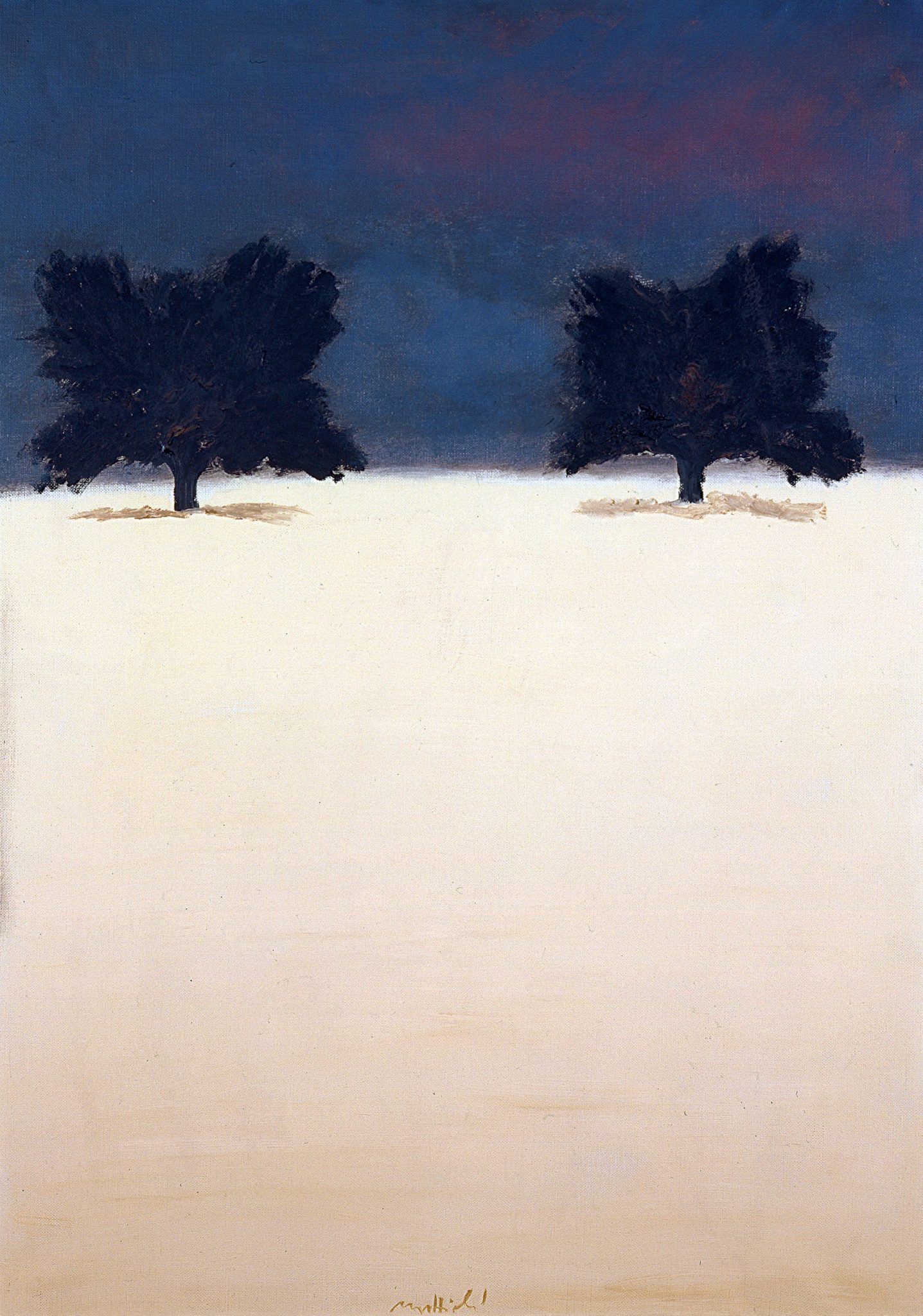 Carlo Mattioli, nato a Modena nel 1911 e per il resto della vita parmigiano, ci appare oggi come una delle figure più rilevanti, nella vicenda dell’arte italiana del secondo Novecento. Molti i cicli a cui lavorò: gli Alberi, i Muri, le Pinete, i Cieli, le forme biancheggianti delle Apuane… Secondo gli Orientali esiste una forma di meditazione (in sanscrito dhiana) che si pratica concentrando l’attenzione su un oggetto, naturale o creato dall’uomo; è il silenzio, la tranquillità di questa forma di meditazione che si coglie nelle opere di Mattioli, come nelle opere di Giorgio Morandi.