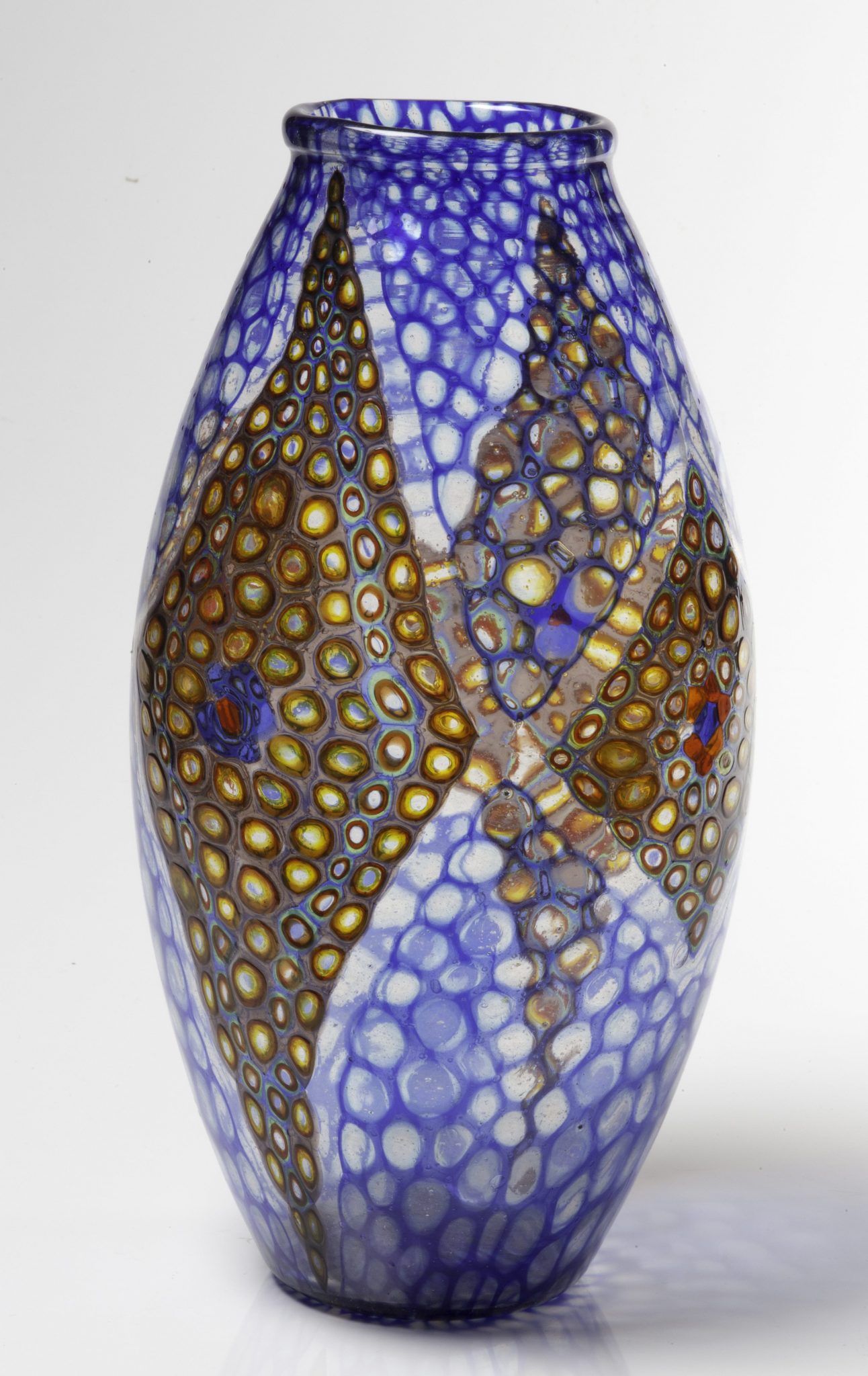 Lotto 10   Vittorio Zecchin Artisti Barovier, Murano, 1924 ca Vaso serie Mosaico Grande vaso ovoidale decorato con mosaico a murrine azzurre e trasparenti con decoro di losanghe di murrine disposte a fasce concentriche multicolori. Bocca ad anello applicata. Diametro cm 20, altezza cm 40 Firma a murrina AB Stima: € 90.000 – 120.000