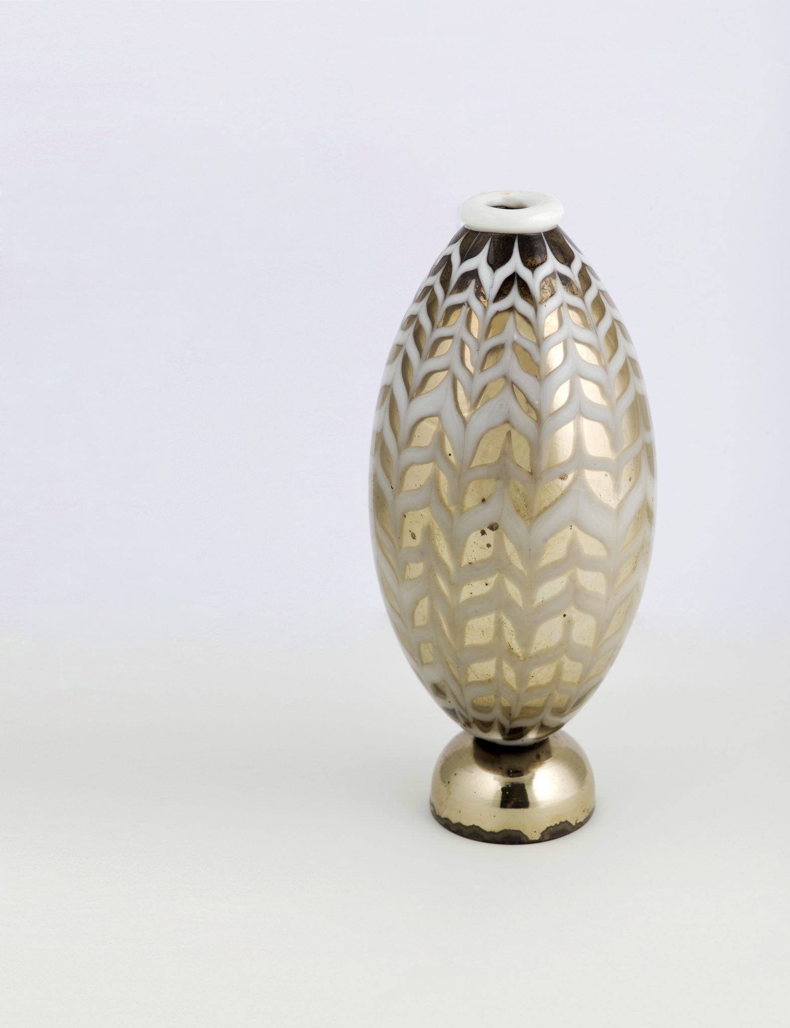 Vaso a forma d’uovo con basamento semisferico in vetro pagliesco con decoro Fenicio interamente specchiato.