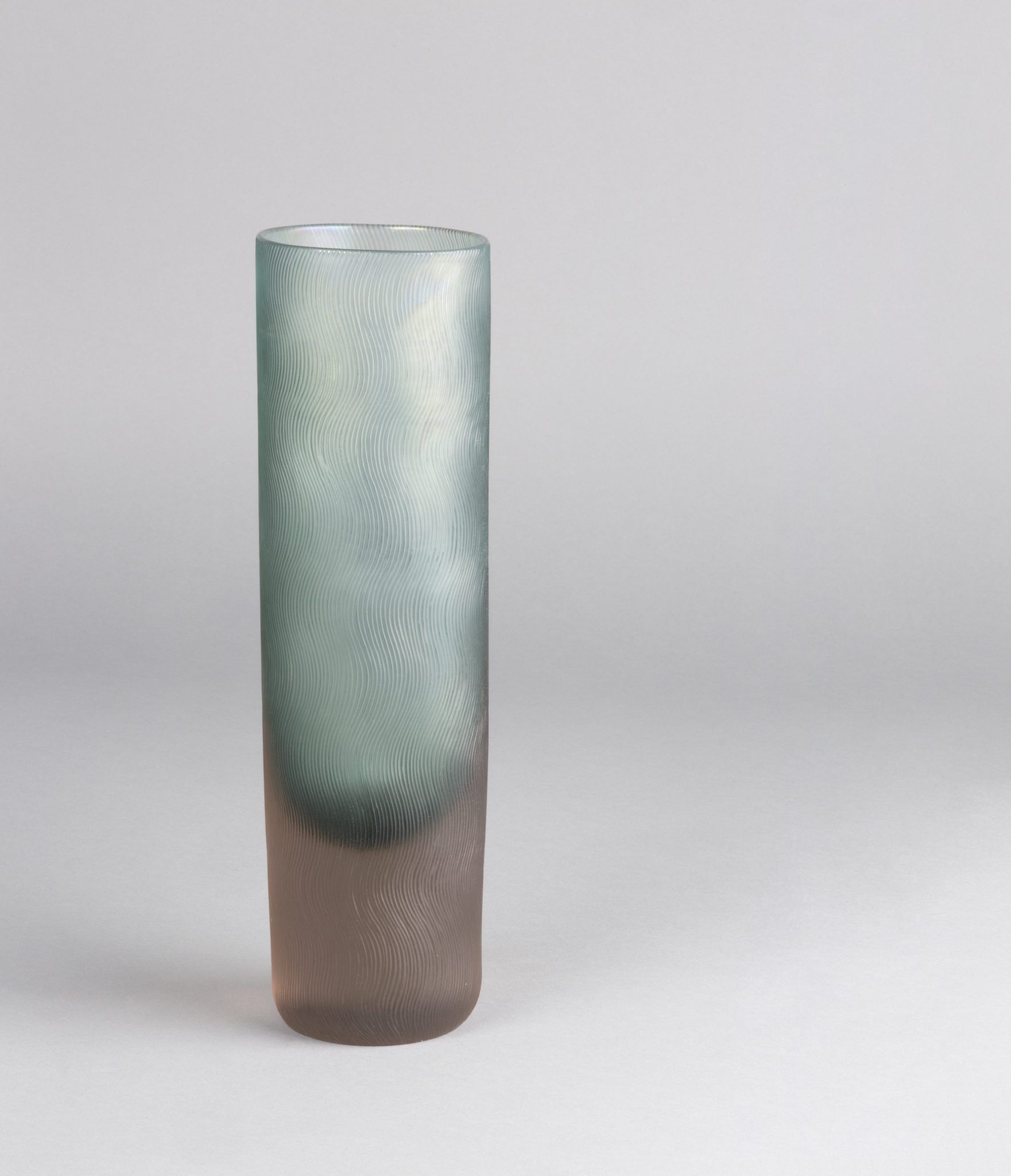 Carlo Scarpa Venini, Murano, 1940 ca Vaso serie Incisi Vaso cilindrico in vetro a due strati di colore interamente decorato con incisioni ad onde e con superficie iridata. Altezza cm 28,5 Stima: € 12.000 – 15.000