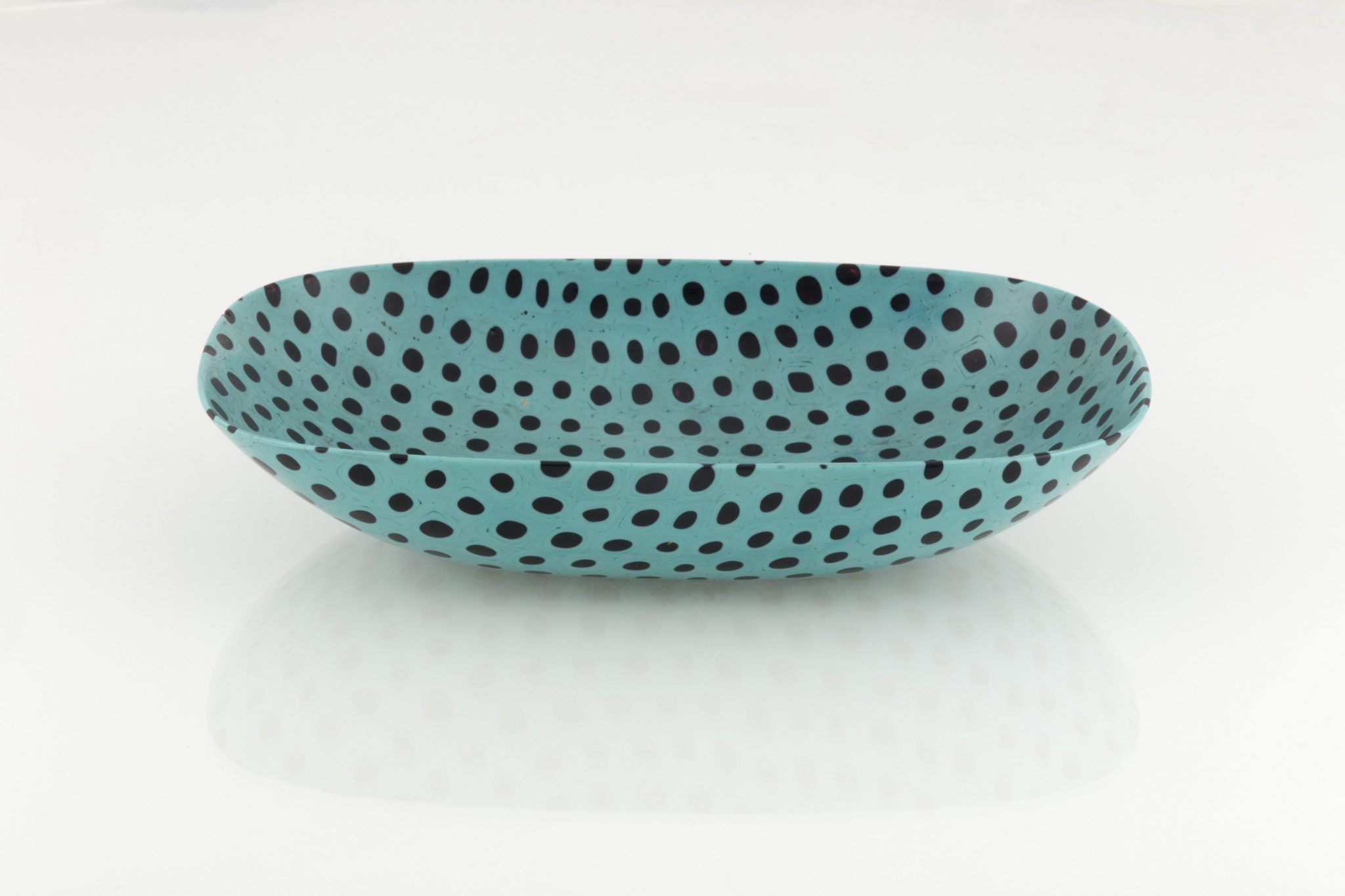 Coppa ovale in vetro a murrine turchese con centro antracite interamente lavorata alla mola.