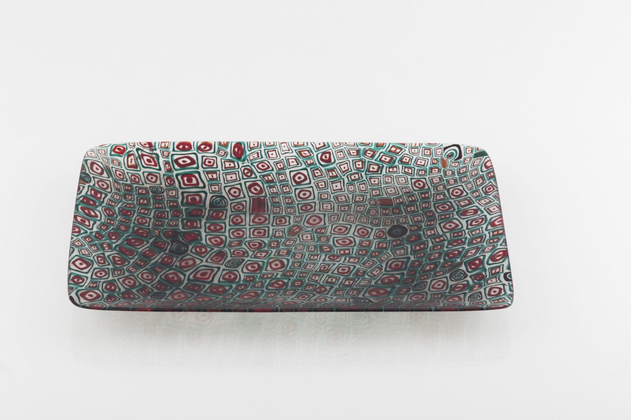 Lotto 144 Paolo Venini Venini, Murano, 1958 ca Vassoio a murrine Vassoio rettangolare in vetro a murrine concentriche rosse e verdi su fondo trasparente interamente lavorato alla mola. cm 25×17 Stima: € 25.000 – 30.000