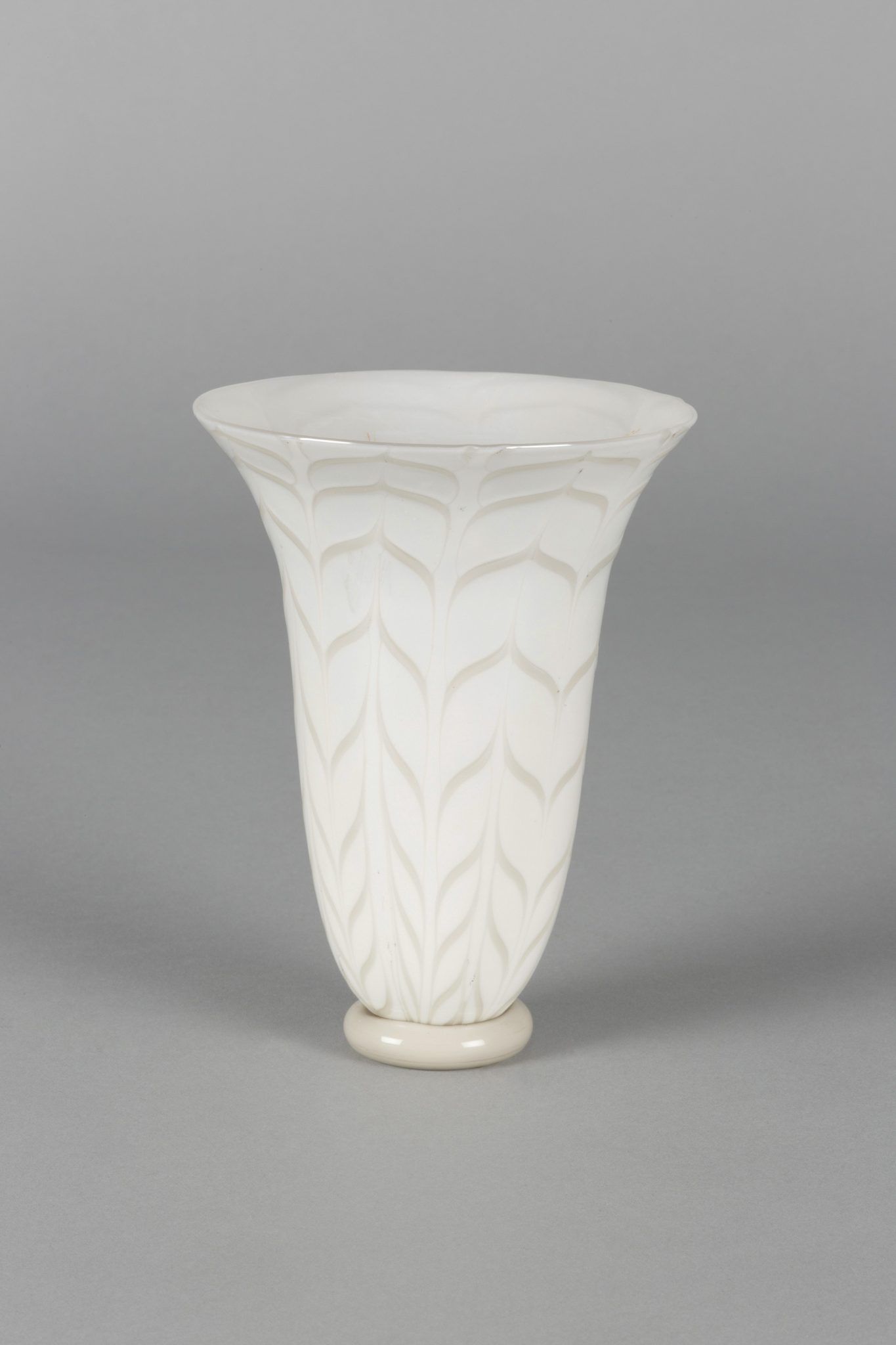Lotto 62   Carlo Scarpa MVM Cappellin, Murano, 1930 ca Vaso serie Fenici Vaso a tromba in vetro lattimo con decoro Fenicio applicato in vetro pagliesco. Diametro cm 11,5, altezza cm 15,5 Firma all’acido MVM Cappellin Stima: € 8.000 – 10.000