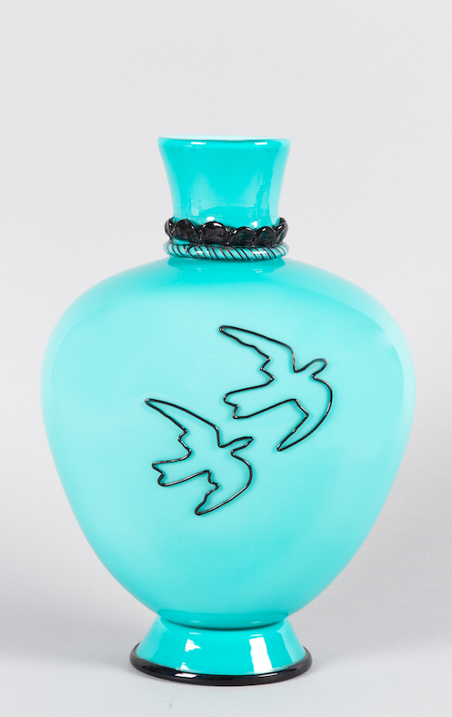 Lotto 15  Tomaso Buzzi                                                           Venini, Murano, 1932 ca Vaso in vetro incamiciato turchese, corpo ovoidale a sezione schiacciata poggiante su piede troncoconico e collo svasato con applicazioni e cordoli in pasta vitrea nera. Al centro decoro di rondini in volo eseguite con filamenti vitrei. Altezza cm 31 Firmato all'acido Venini Murano e reca tracce di vecchia etichetta cartacea Stima: € 50.000 – 70.000
