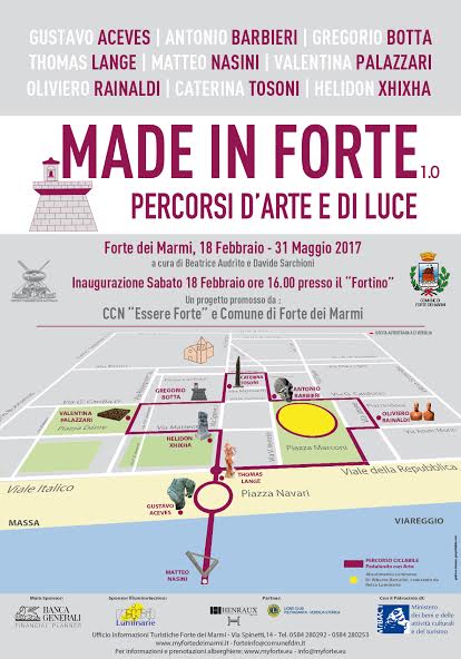 La prima edizione di MADE IN FORTE 1.0. Percorsi d’arte e di luce (a cura di Beatrice Audrito e Davide Sarchioni) si terrà a Forte dei Marmi dal 18 febbraio al 31 maggio 2017. Un percorso d’arte urbano che intende porsi come una rassegna d’arte contemporanea, in simbiosi con il territorio nel quale prende forma.