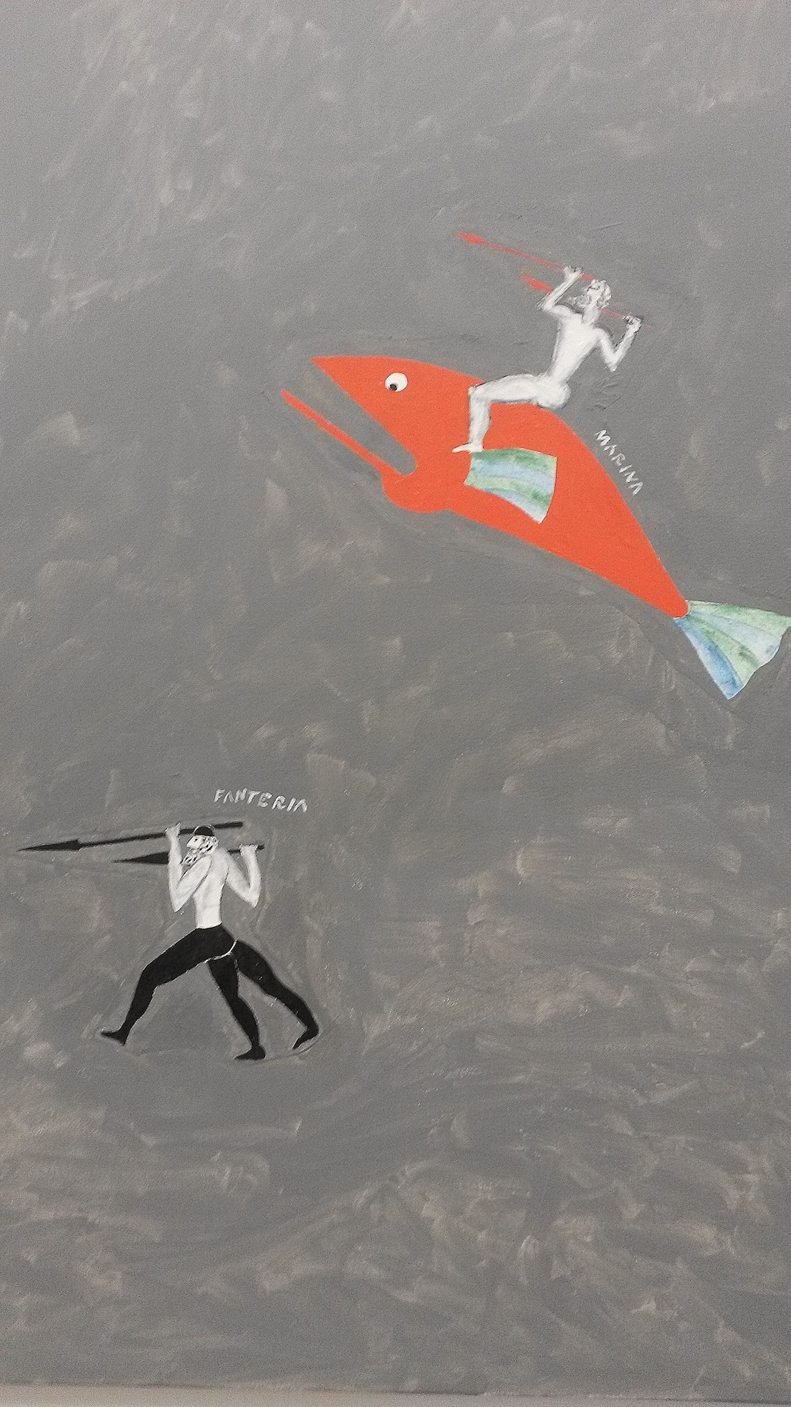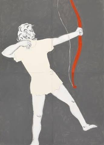 Silhouette senza volume, sono le figure che popolano il mondo di Tatafiore, nei dipinti su carta e su tela. Sintetiche nel loro darsi elusivamente per una semplice linea di contorno tracciata con la matita. Una pittura piatta, che lascia spazio a larghe campiture di colore, zone d’oro, bianco, nero, grigio, arancione, prive di sfumature o variazioni. In questo mondo dove le proporzioni umane spesso non rispondono alla realtà ma solo alla gerarchia della rappresentazione, Tatafiore si muove con leggerezza e ironia nella messa in scena del mito di Ulisse, al quale è legato sin dagli anni ’80. Tre i momenti salienti del racconto: le Sirene tentatrici, il ritorno a Itaca, la lotta con i Proci.